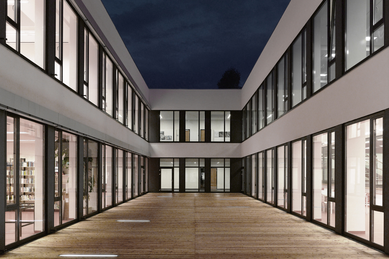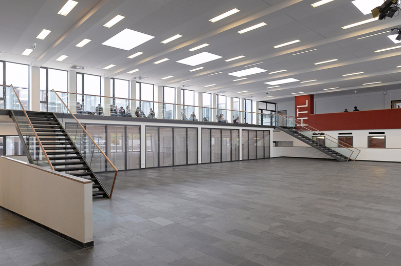 Als Prämisse für den Entwurf galt zum einen der Verzicht auf größere Neubauteile, eine übersichtliche und einfache Wegeführung im Gebäude, ein weitgehender Außenraumbezug für die Aufenthaltsbereiche sowie eine Aktivierung des Untergeschosses als vorhandene Baumasse, um einen kompakten Baukörper mit möglichst geringen Betriebskosten zu schaffen. Die Neuordnung nutzt die vorhandene modulare Baustruktur mit einem robusten Tragsystem und ergänzt ein leistungsfähiges Erschließungskonzept. Es werden flexible Raumzonen angeboten, die optimal belichtet und natürlich belüftet werden. Nachträgliche Anpassungen an geänderte Raumanforderungen sind problemlos umzusetzen. Unter Beibehaltung des Gebäudekonzepts wird die geschlossene Baustruktur durch zwei neue Innenhöfe aufgebrochen, die thematisch identifikationsstiftend sind, die Orientierung erleichtern und Lichtpunkte an den Verkehrswegen setzen. Die leistungsfähige Haupterschließung durch zwei Nord- Süd „Straßen“ bleibt erhalten. Die drei Werkstatt-/ Laborbereiche Bautechnik, Elektrotechnik und Mechatronik werden analog durch ein bzw. zwei Querspangen verknüpft. Die Verbindung zu Trakt 5 (HTL) als gedeckter Kolonnadengang kann ebenso als witterungsgeschützte Pausenfläche genutzt werden. In Trakt 1 wird das Untergeschoss für eine attraktive Nutzung aktiviert. Hierfür wird an der Ostseite ein Lichtgraben ebenengleich mit der Haupteingangsebene angeordnet. Am zentralen Kreuzungspunkt entsteht eine neue attraktive Vertikalerschließung. Diese Lichthalle dient zum einen der Belichtung und dem Ausblick für die Konstruktionssäle, zum anderen als separate Pausenfläche für den Werkstattbereich.