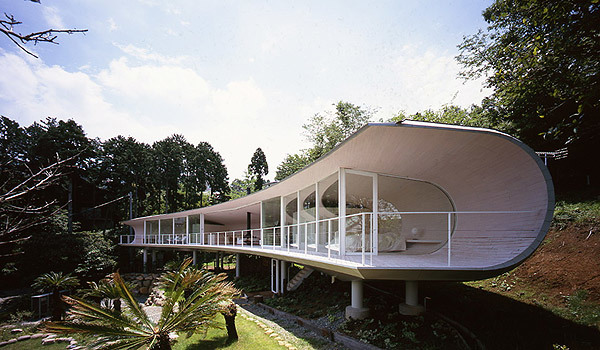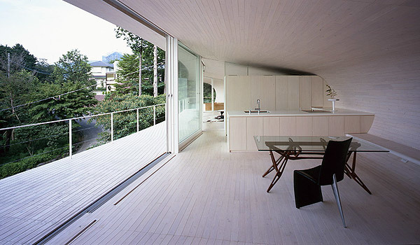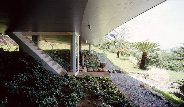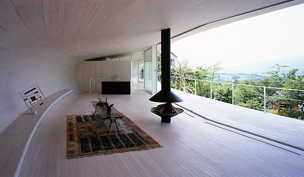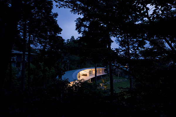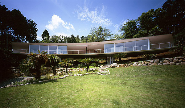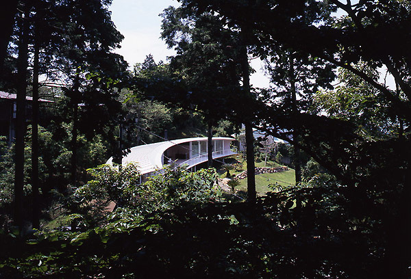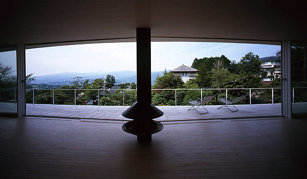 This site is located on the slope in the north side of villa area in South Hakone. The scenery of the north side is rare because of its opening to look over Mt.Fuji without being almost distributed by any other houses in the fine day. On the other hand, looking at a variety of houses whose shapes and colors are unique in other sides of the site, we are instantly pulled back to Japanese reality by a sense of relief blessed with nature. Standing in the site, in order not to allow people to look at east, west and south sides, the idea that the crescent-shaped plan which opens up to north corresponding to the site and the cross section which looks like the "C" character( the "U" character which falls down) naturally comes up to mind right away.