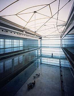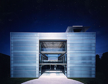 924㎡のギャラリーは、古い工場を改装したものである。A館と同様の外観の変化 が、このギャラリー南側のファサードでも起こる。この面全体は、閉めると障子のように見える、半透明のFRP製のシャッター6組で構成されている。パネル が外側にスライドして奥行き5mの日よけをつくり、内部ギャラリーはそのまま外へと通じて、周囲の風景と一体化することになる。
