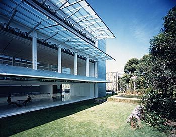 紙のメーカーの展示、開発、販促の場としての資料館。美術館(A館)とギャラリー(B館)に分 かれている。美術館は単純な正方形のプランを3等分し、庭の景観を楽しめる南側にオフィス機能を、北側に展示空間を配し、その間を3層吹き抜けのアトリウ ムとしている。南、北のブロックは完全に独立した構造とし、その独立性と半屋外的空間の特性を強調するため、南北ブロック間に配したアトリウムの東西面を FRP製のスタッキング・シャッターで開閉できるようにした。シャッター以外の外周部も同じFRPパネルとし、さらに南側の庭園側はFRPパネルが蔀戸と して開閉する。