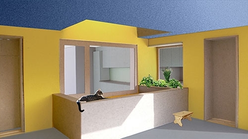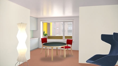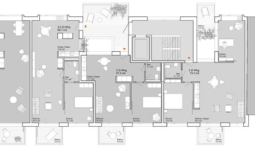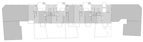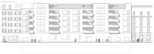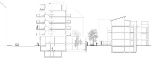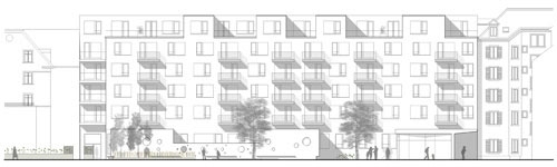 Der dahinter liegende kleine Hof bringt Luft und Licht in die Tiefe des Grundrisses. Er bietet aber auch Hand zu nachbarschaftlichem Kontakt auch über mehrere Geschosse hinweg. Mit der so ausgebildeten Einkerbung ins Gebäudevolumen kann auf einfache Art auf die Lärmproblematik an diesem belasteten Standort reagiert werden.