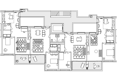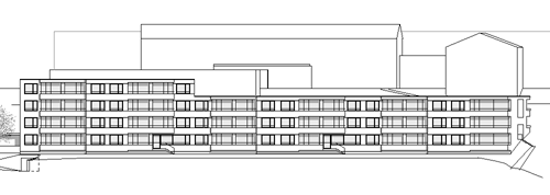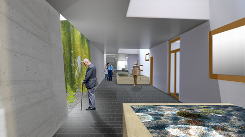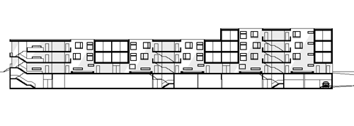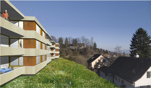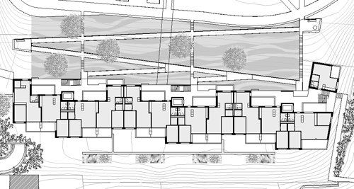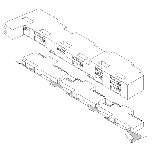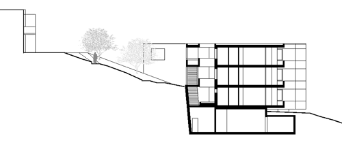 Der Gebäudekörper liegt, das Eingangsgeschoss leicht eingegraben, am unteren Ende der Hangkante. Eine Reihe von Lichthöfen begleitet in regelmässigem Rhythmus die rückwärtige Gebäudeerschliessung. Sie versorgen den bergseitigen Zugangsweg grosszügig mit Licht und Luft und machen diesen zum Erlebnisraum.