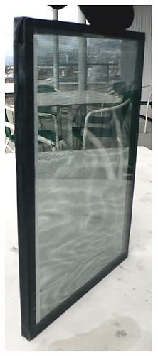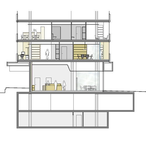 Die Fassadenverglasung wird zweischichtig mit einem dem klassischen Tüllvorhang entlehnten Muster bedruckt. Im Vorbeigehen entsteht durch die Überlagerung der Strukturen ein sich ständig ändernder Changeant-Effekt. Aus dem Bedürfnis nach Diskretion und Blendschutz entsteht ein identitätsstiftender, zeichenhafter Auftritt zum Platz hin.
