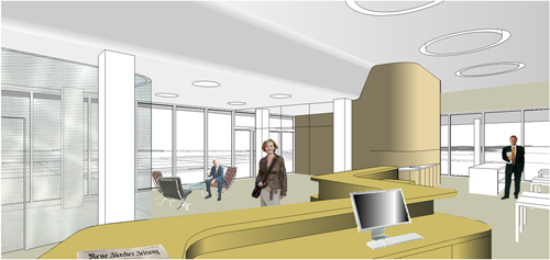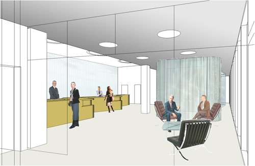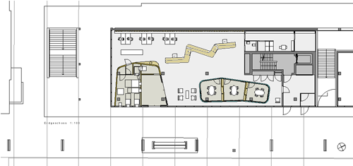 Einbau einer Bankfiliale in einen modernen Geschäftshausneubau. Das verglaste Erdgeschoss wird grundsätzlich offen belassen. Zwei freistehende Körper und eine geschwungene Theke werden so in den Grundriss eingepasst, dass alle notwendigen Bereiche in ihren funktionalen Bezügen festgelegt sind.