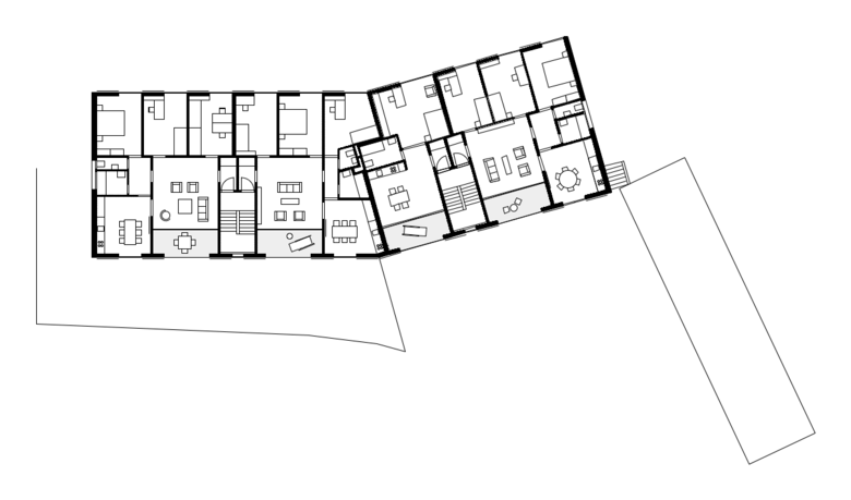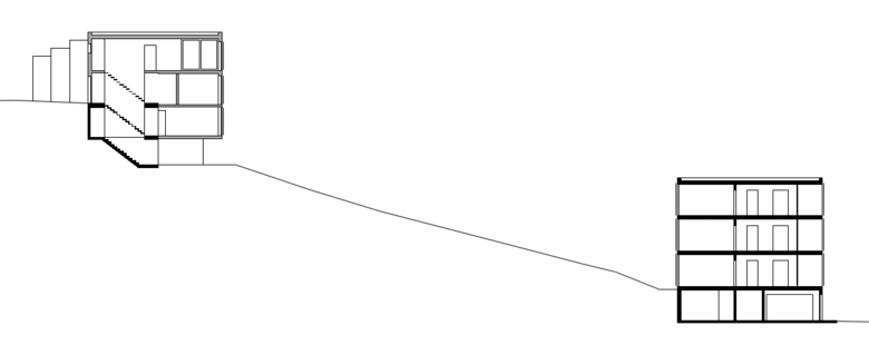 Die Arealüberbauung Burghalde besteht aus zwei Teilen: Das Mehrfamilienhaus am unteren Ende des Grundstücks nimmt das städtebauliche Muster der Nachbarüberbauung auf, während an der oberen Quartierstrasse vier Reihenhäuser die untere Bebauung überblicken.