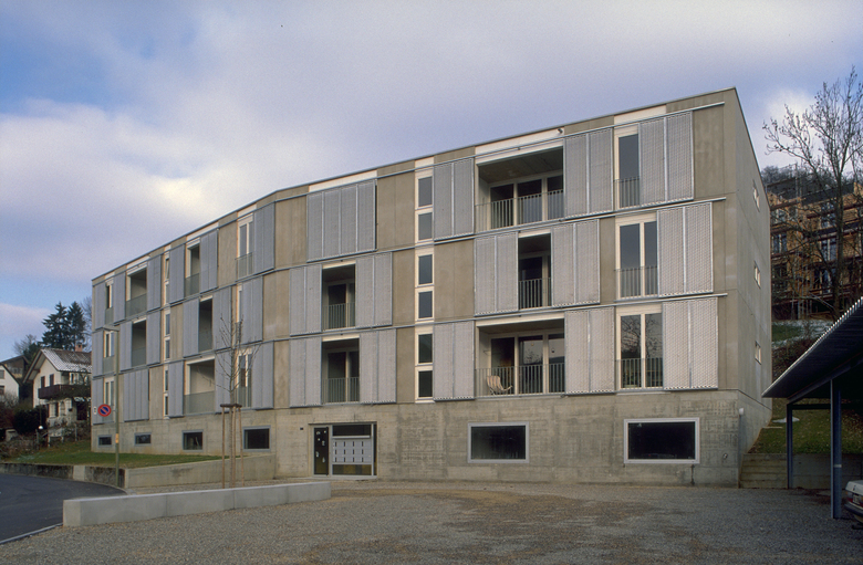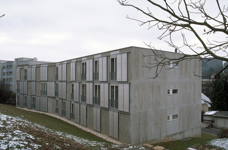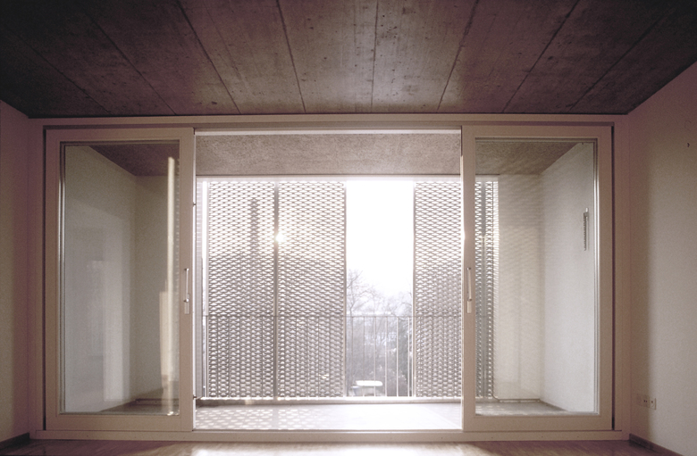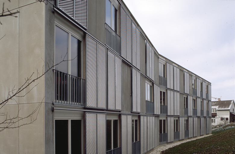 Die Fassaden sind umlaufend mit raumohen, rohen Duripanelplatten verkleidet. Ebenfalls roh belassene Schiebeläden aus grossmaschigem Aluminium-Streckmetall sind als Sonnen- und Einsichtsschutz davor montiert.
