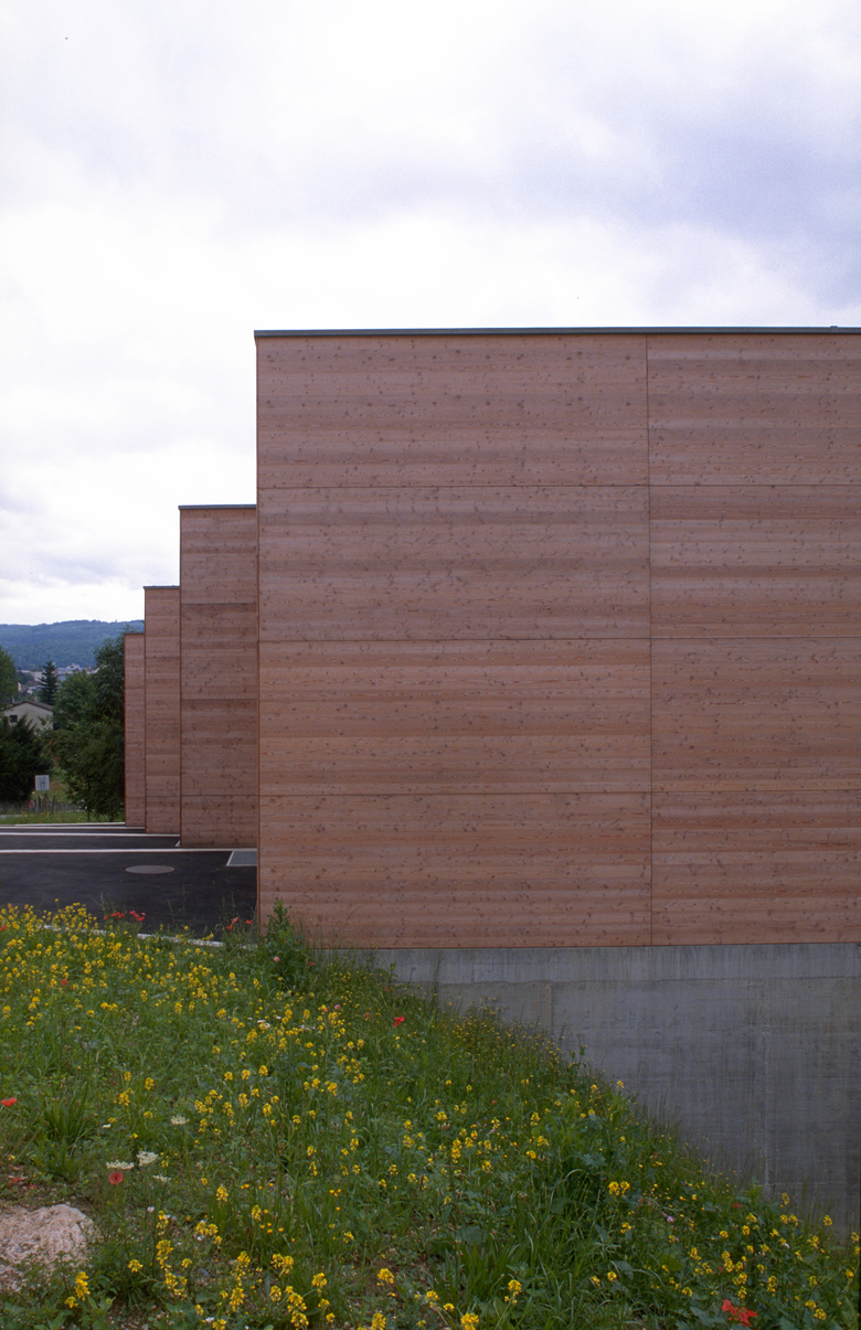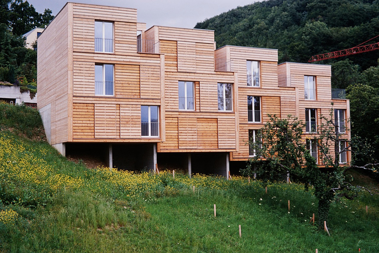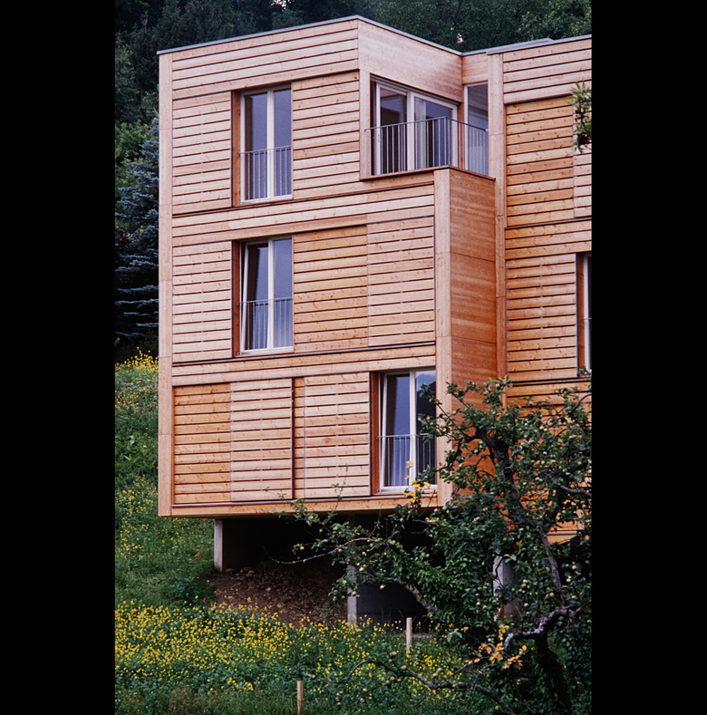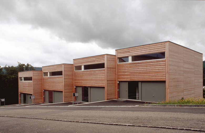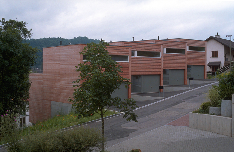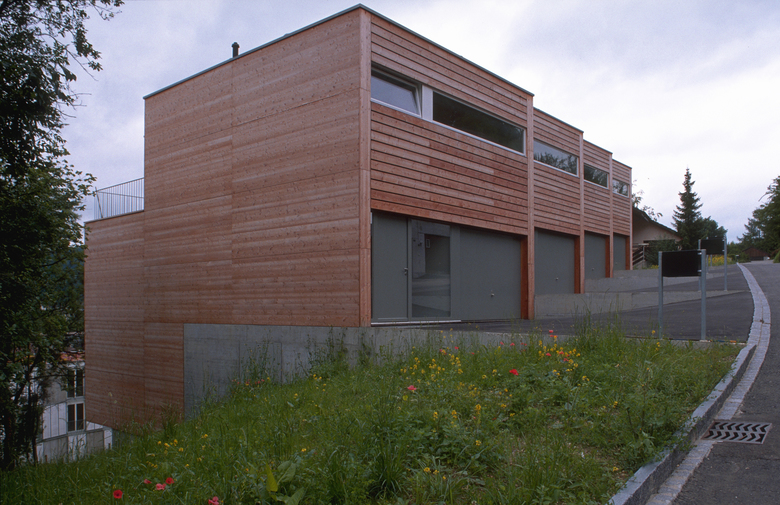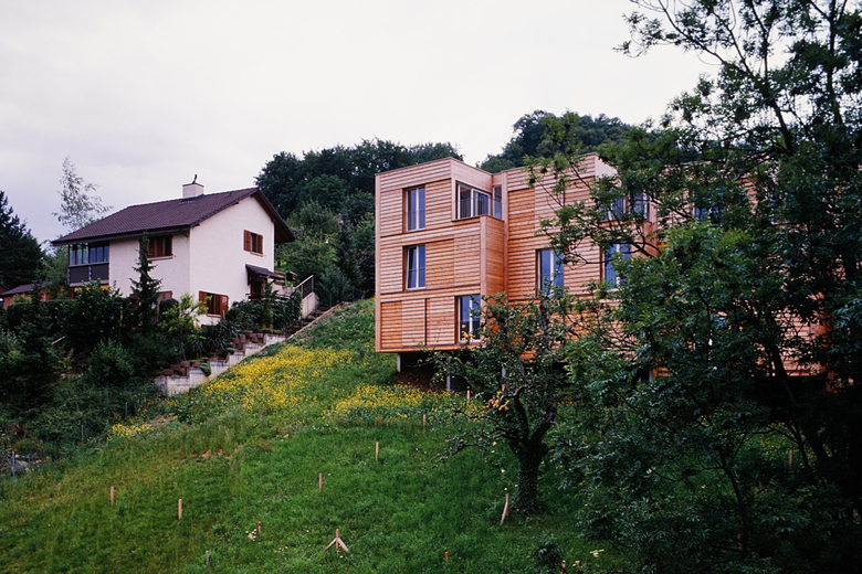 Vier Reihenhäuser, in vorfabrizierter Holzbauweise erstellt, stehen als aneinandergereihte Kuben auf Betonscheiben und überblicken das Grundstück. Die einzelnen Häuser sind im Grundriss und in der Höhe zueinander versetzt und folgen so dem Verlauf des Geländes und der Strasse.
