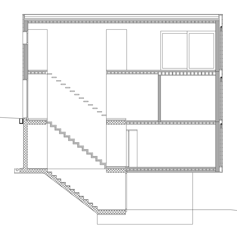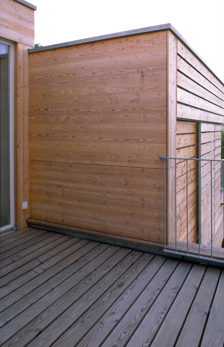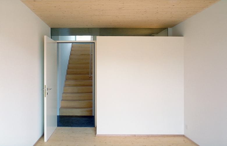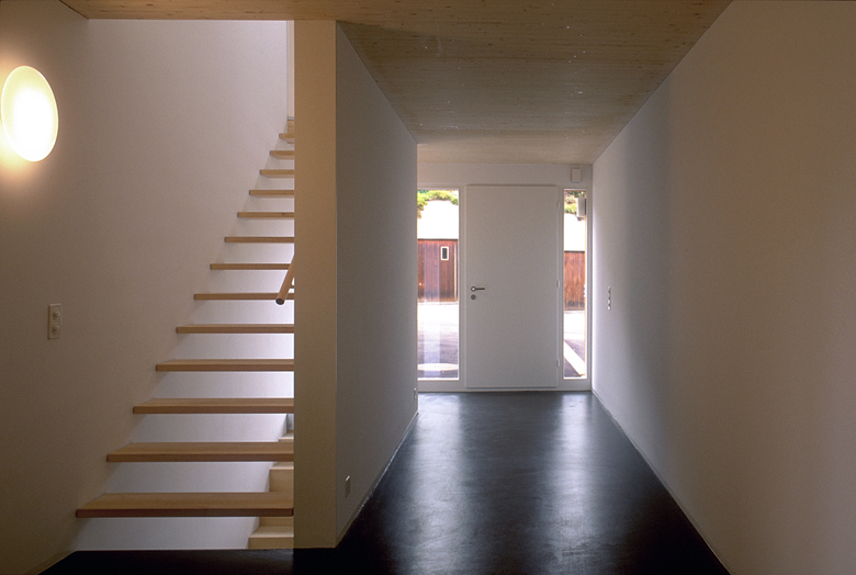 Bedingt durch das steile Terrain ist das Wohnen mit Terrasse zuoberst angeordnet, die Schlafräume befinden sich hingegen unter dem Eingangsniveau, ohne Kontakt zur Strassenseite.