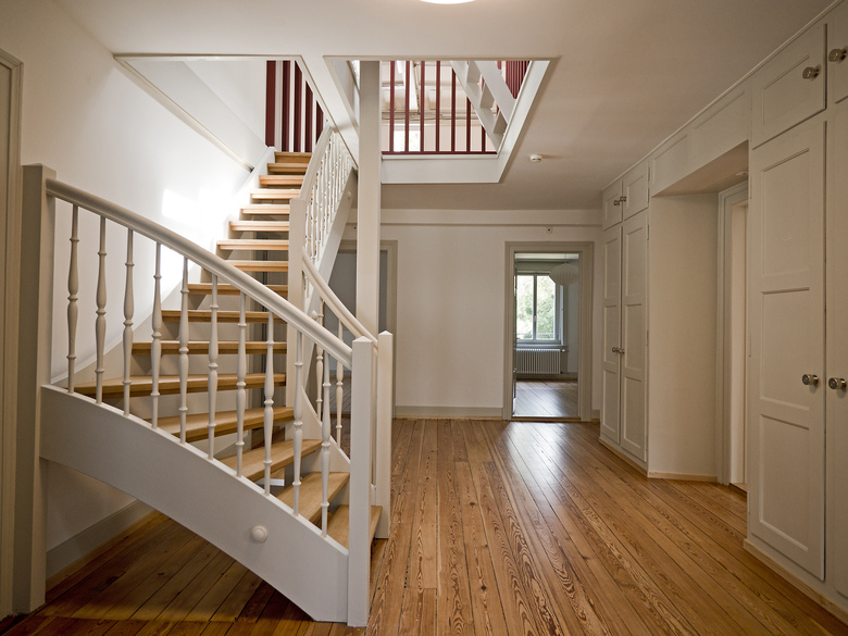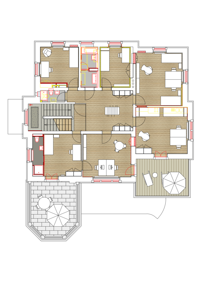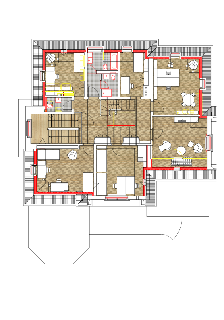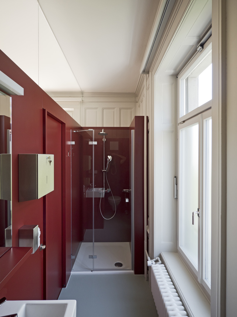 Das neue Raumprogramm mit zusätzlichen Nasszellen, einer Grossküche und einem Esssaal für alle Kinder wurde in enger Absprache mit der Denkmalpflege umgesetzt. Das Untergeschoss wurde durch den Einbau einer Garderobe und von WC's zu einem separaten Eingangsgeschoss für die Kinder aufgewertet.
