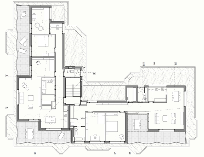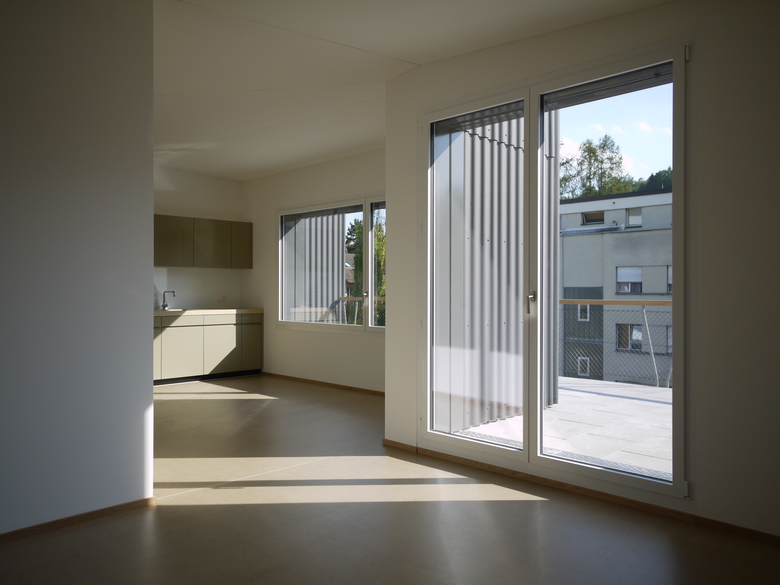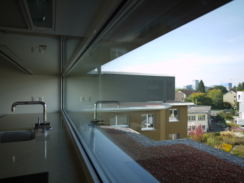 Der neue Dachaufbau wird über das um ein Geschoss erweiterte Treppenhaus im Scheitel des L-förmigen Gebäudekörpers erschlossen. Die Grundrisse wurden von innen heraus so entwickelt, dass aus dem strengen ‚Korsett’ der baurechtlichen Möglichkeiten optimale innen- und aussenräumliche Qualitäten erwachsen konnten.