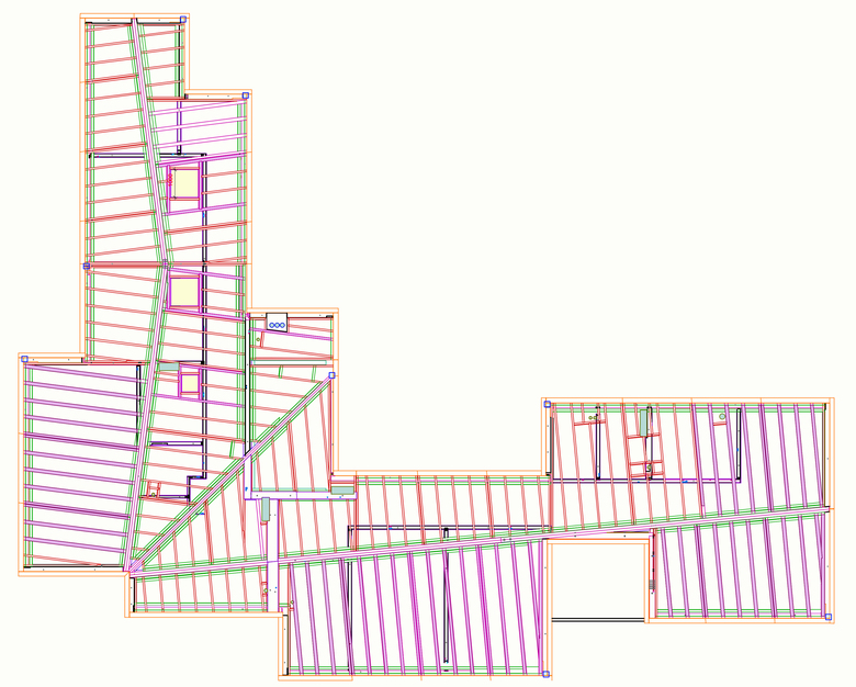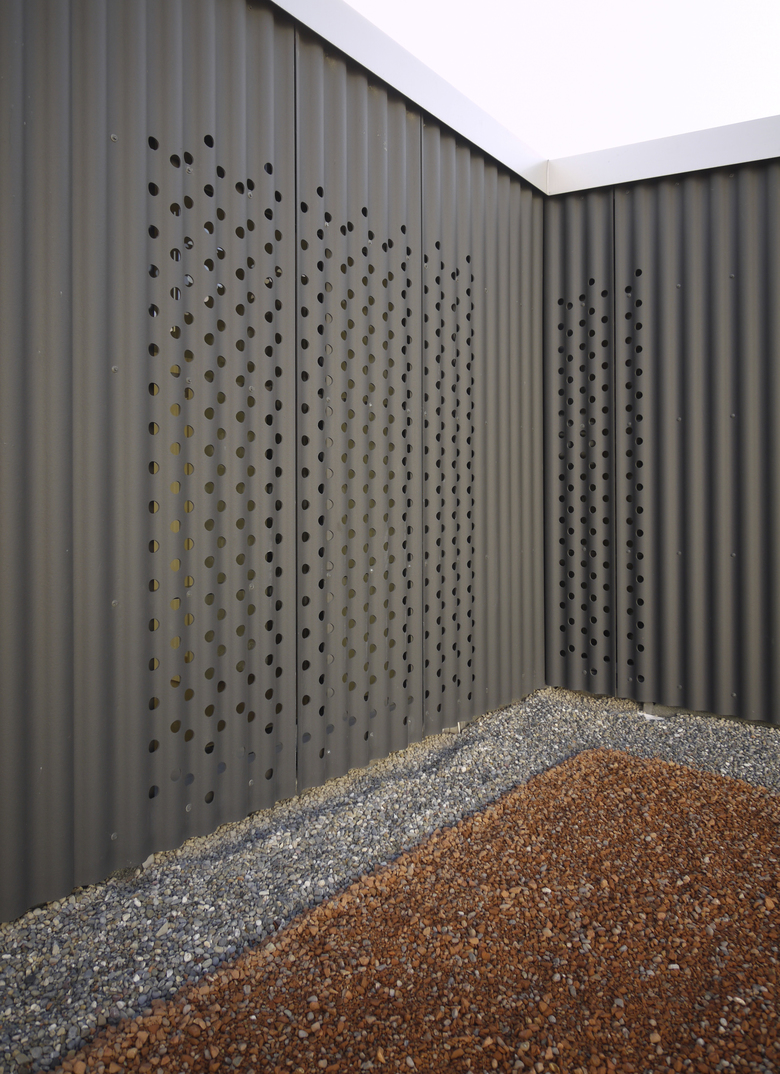 Das stark gegliederte Volumen wird durch ein flach geneigtes Satteldach zusammengebunden, welches auch wesentlich den räumlichen Charakter des Innenraums bestimmt. Der First läuft, unabhängig von der Geometrie der darunterliegenden Wände, als zweimal geknickte Linie über das ganze Dach durch.