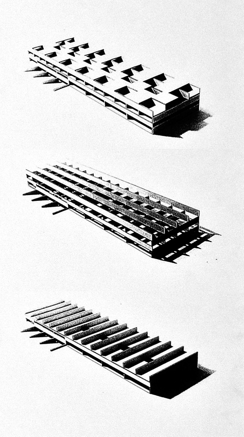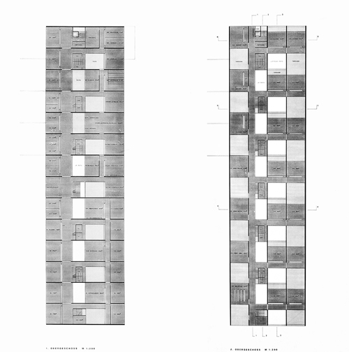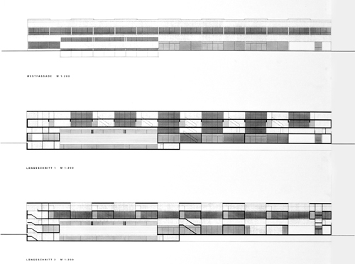 Die das Feld durchziehenden Wassergräben und die sie kreuzenden Fusswege werden als System im Gebäude wieder aufgenommen. Geschossweise wechseln sich Nord-Süd oder Ost-West orientierte Raumschichten ab.
