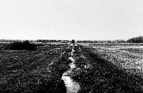 'Das vorgefundene besondere Landschaftsbild, geprägt durch die starke Geometrie und die extreme Horizontalität der Verrieselungsanlagen wird zum Entwurfsthema.