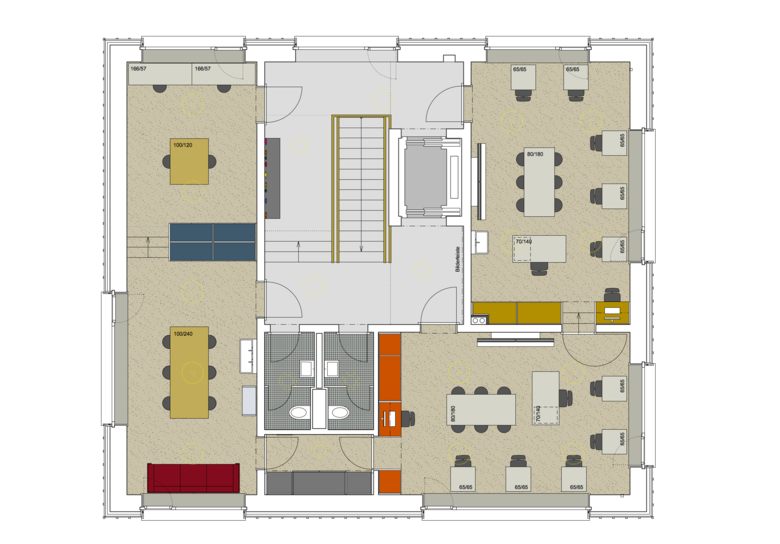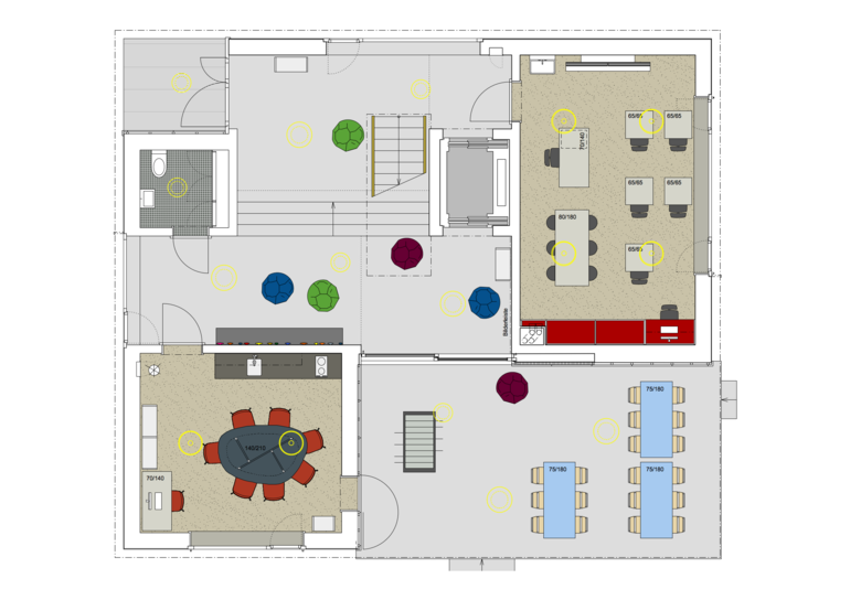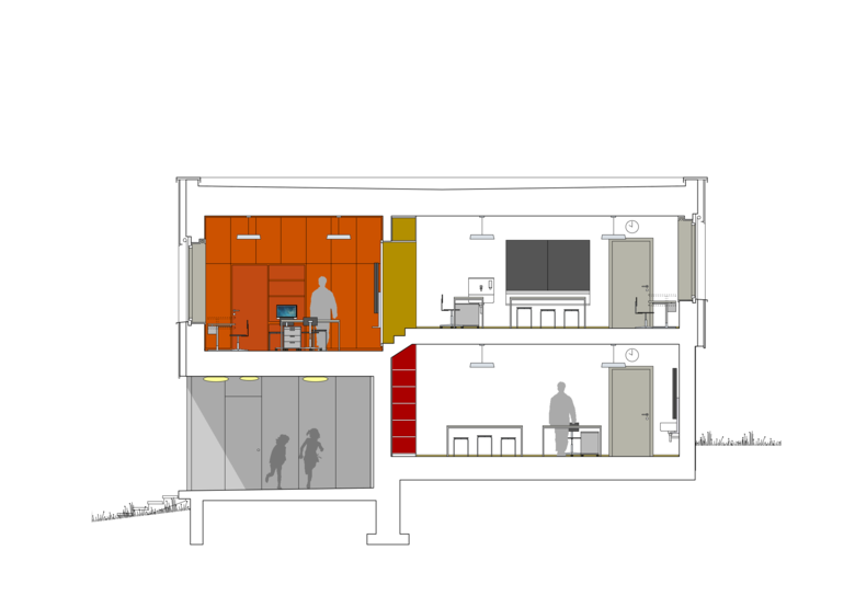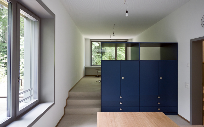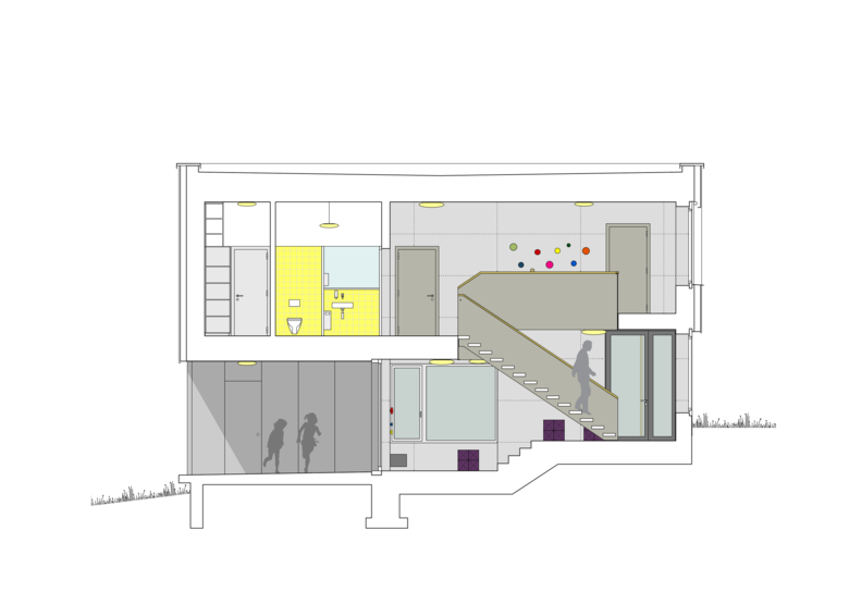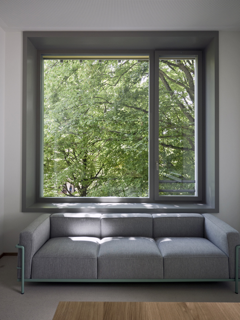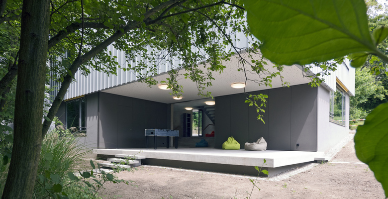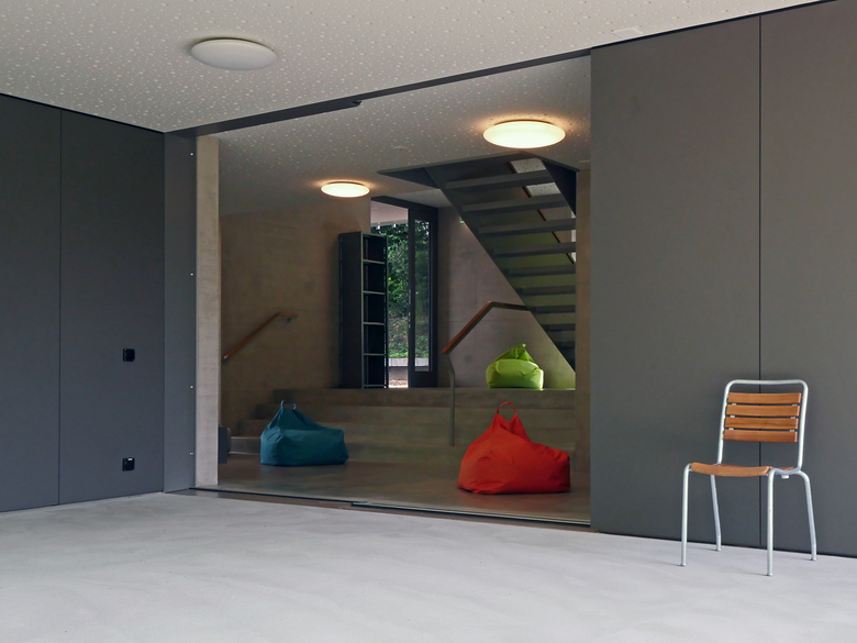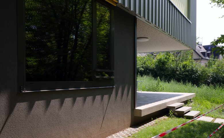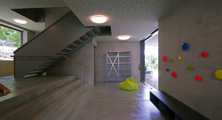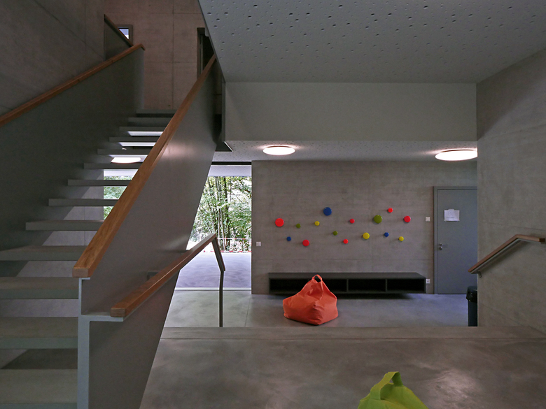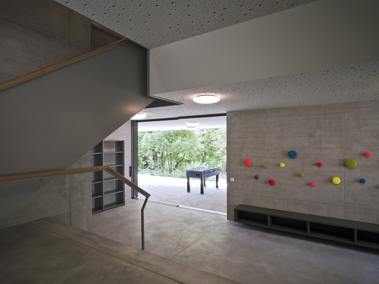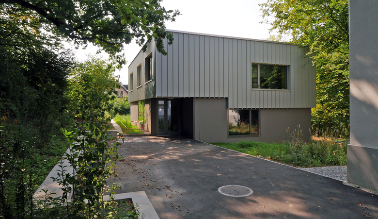 Die Adressbildung über Eck schafft eine selbstverständliche Verbindung aller drei Gebäude über einen gemeinsamen Vorplatz und eröffnet einen Sichtbezug vom Haupteingang über den gedeckten Aussenraum bis in die dahinter liegende Gartenanlage. Mit der Abtreppung des Erdgeschosses wird der natürliche Geländeverlauf im Innern des Hauses erlebbar und der Neubau sorgfältig ins gewach-sene Terrain eingebettet.