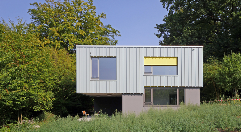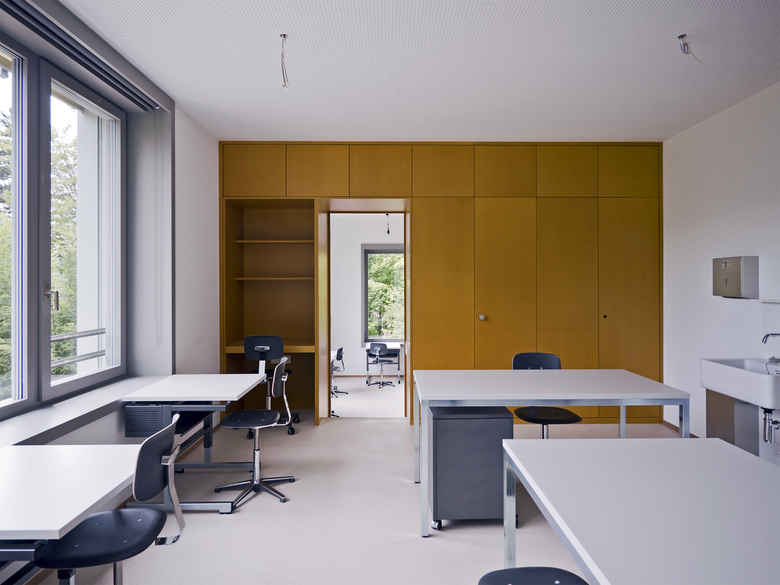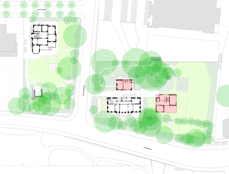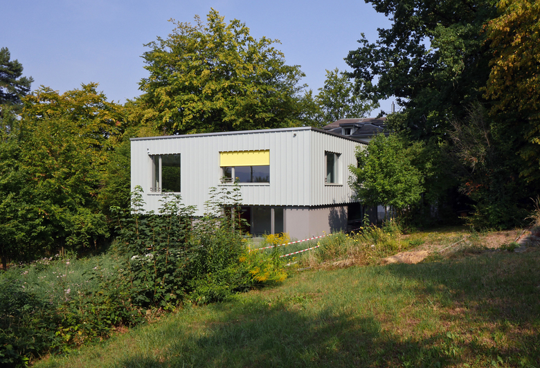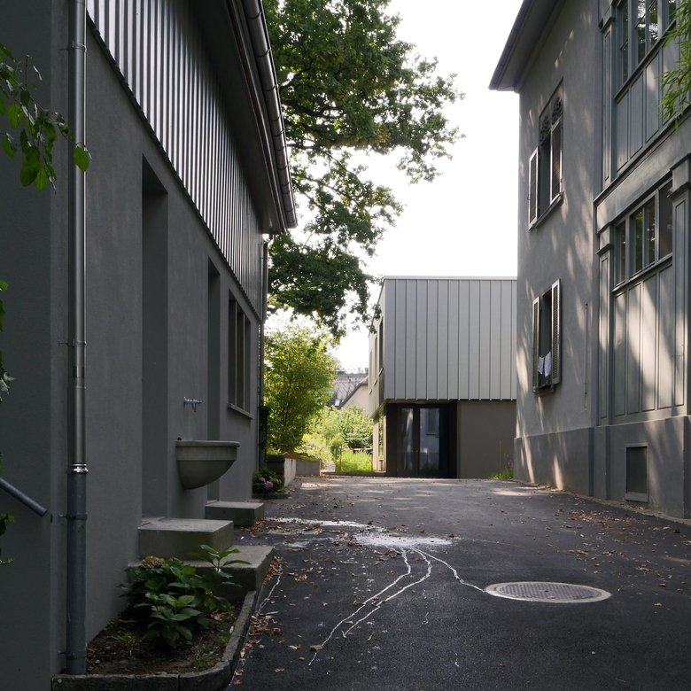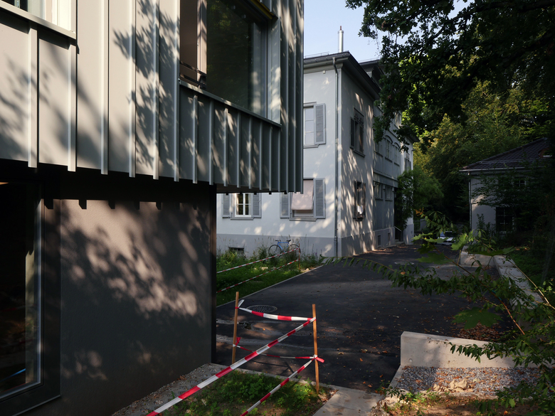 Inmitten eines stark durchgrünten Villenviertels im Quartier Riesbach wurde zu einem denkmalgeschützten, als Kinderheim genutzten Ensemble ein kleiner Ergänzungsbau für den fehlenden Schulraum erstellt. In dieser städtebaulich sensiblen Situation ist der Neubau als annähernd quadratisches Volumen deutlich kleiner als das Hauptgebäude, jedoch grösser als das Nebengebäude und soll so weder den imposanten Baumbestand des geschützten Gartens stören, noch in Konkurrenz zu den bestehenden Gebäuden treten.