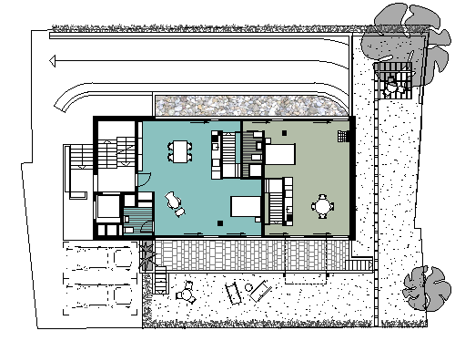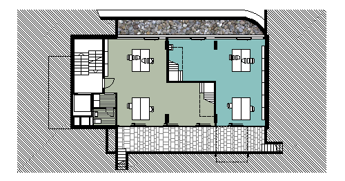 In Erd- und Untergeschoss werden zwei je doppelgeschossige Atelierwohnungen vorgeschlagen. Beide Wohnungen profitieren so von einem direkten Zugang zum Garten. Der bestehende, abgesenkte Lichthof wird zum Aussen-Werkhof aufgewertet.