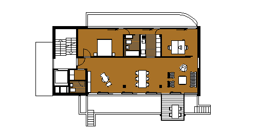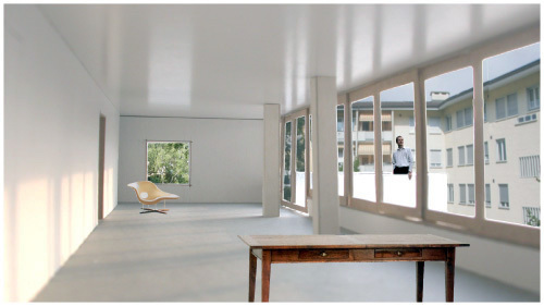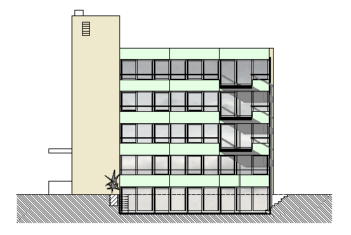 Ein Bürohaus aus den 70-er Jahren sollte saniert und neu zum Wohnen genutzt werden. Eine neu eingeführte Längswand teilt die Wohnung in den Obergeschossen in eine südostorientierte, sonnige Wohnzone und eine nordwestorientierte Seite