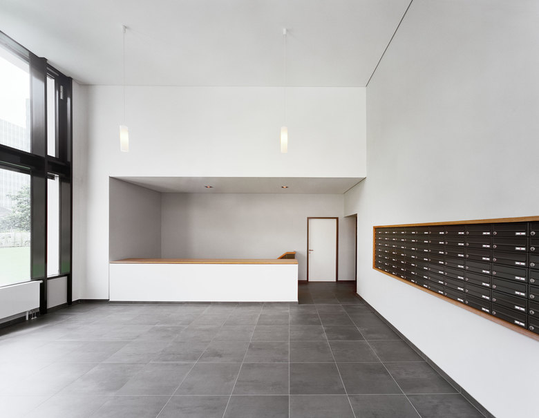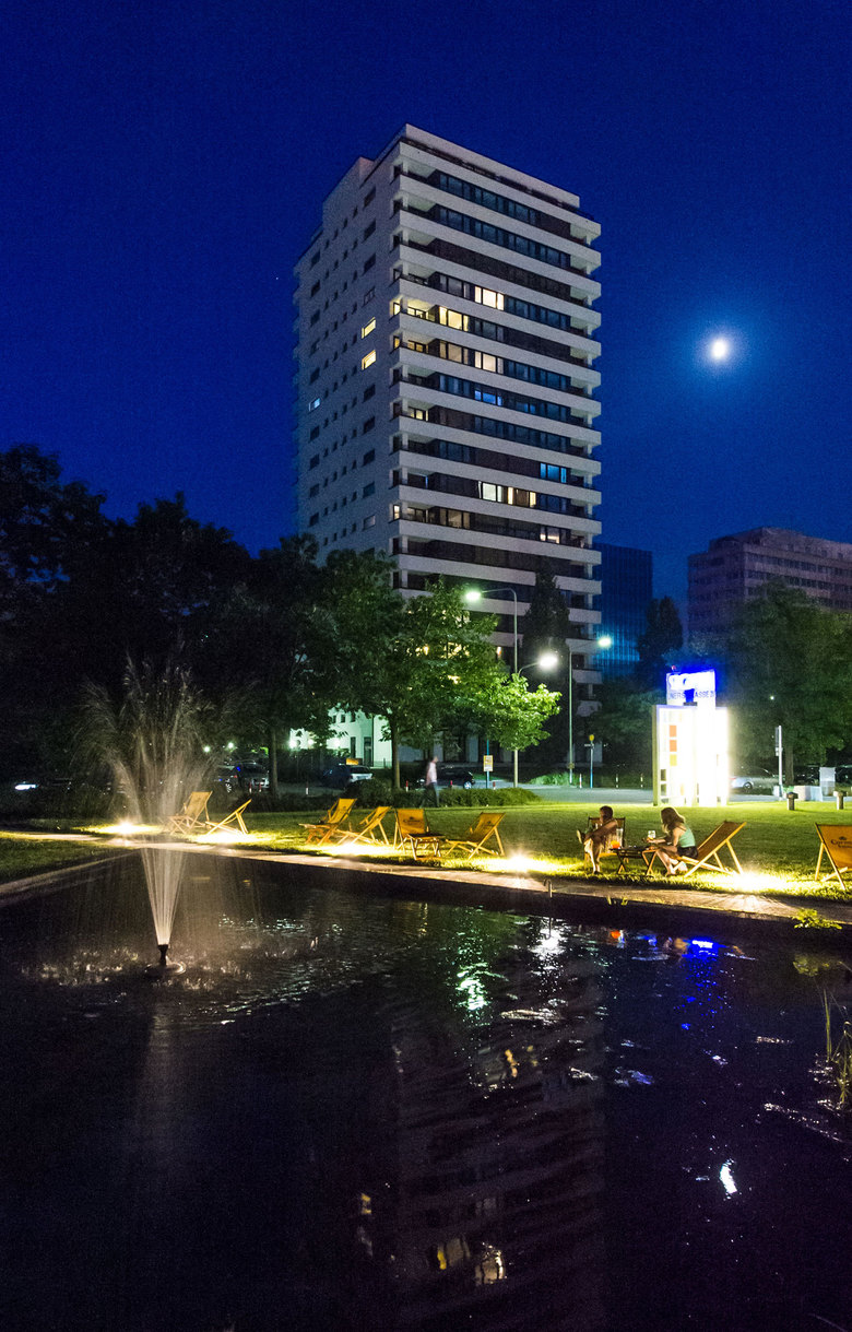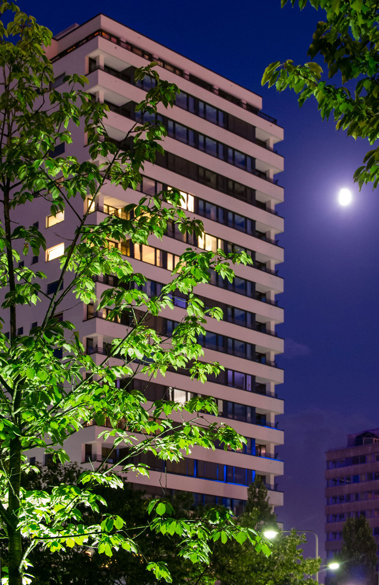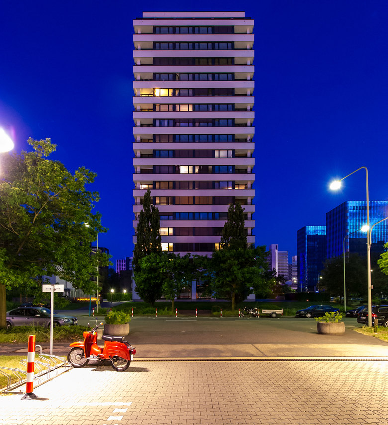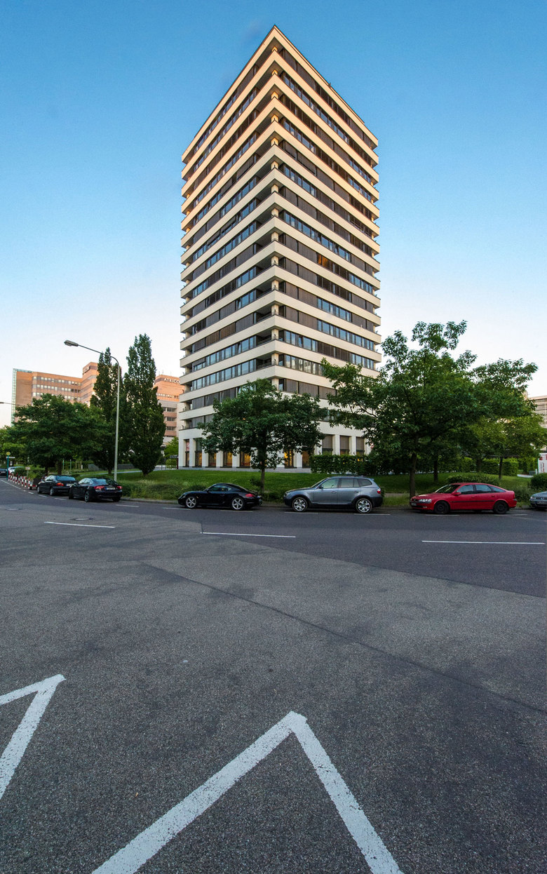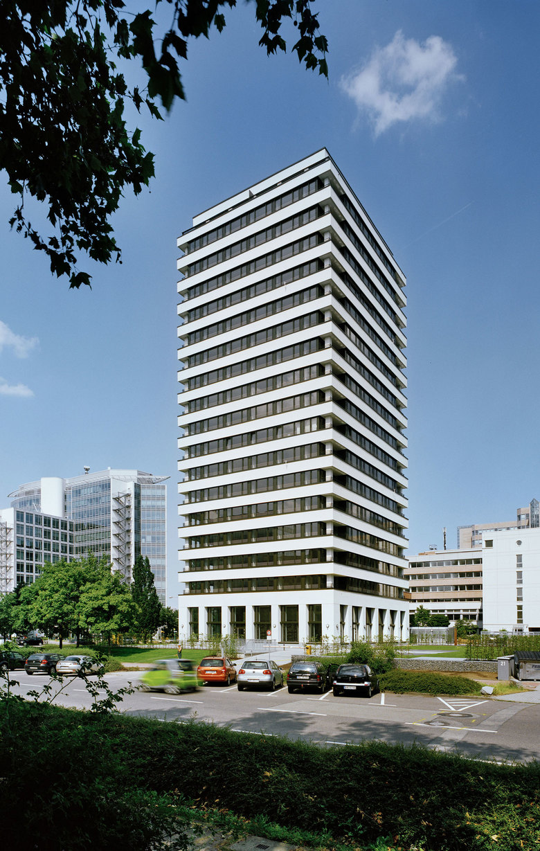Das Lyoner Viertel in Frankfurt-Niederrad erhält ein neues Gesicht: Durch Umnutzung in Wohnraum soll dem zunehmenden Leerstand der Büroflächen begegnet und eine städtebauliche Erneuerung eingeleitet werden. Als Pionierprojekt präsentiert sich die Transformation eines leerstehenden Bürohochhauses aus den späten 1960er-Jahren in ein Wohnhochhaus mit 98 Wohneinheiten. Der schlichte Kubus wurde um drei Geschosse (inklusive des abschließenden Staffelgeschosses) erhöht, die Brüstungen abgesenkt und an den Gebäudeecken Loggien eingezogen. Die nunmehr eleganteren Proportionen, die auf die klassische Moderne verweisenden Fensterbänder über weißen Brüstungen sowie der klar strukturierte Sockel spiegeln die funktionalen Veränderungen im Inneren. Aufgrund des quadratischen Grundrisses und der Entfernung von zwei Aufzügen konnten in den Kern Sanitäranlagen wie auch sonstige Infrastruktur eingesetzt werden. Flexible Grundrisse erlauben die Organisation als 2- bis 7-Spänner.