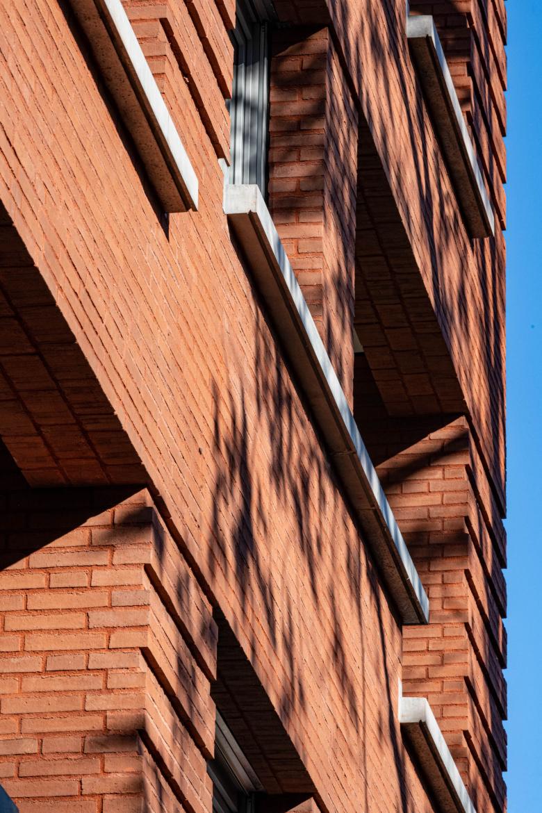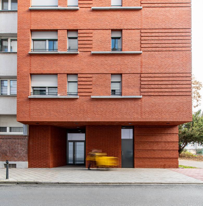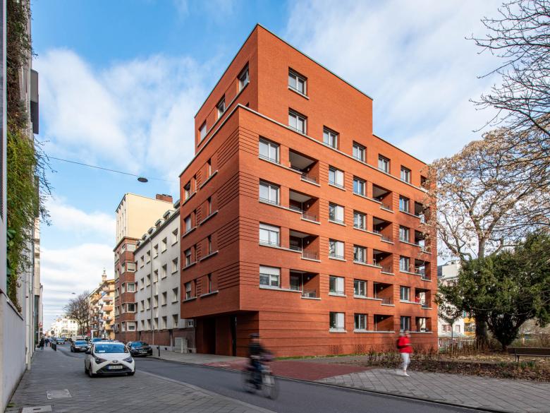 Der Baukörper des Neubaus nimmt die Dimensionen der Nachbarbebauung mit ihrer Traufhöhe auf und leistet so einen Beitrag zur Stadtreparatur. Ein Gedanke, den die warmtonige, reliefartig gestaltete Klinkerfassade mit Bezügen auf die europäische Baugeschichte weiterführt. Die Ecksituation – und damit der Bezug zum gegenüberliegenden Güterplatz – wird durch ein überhöhtes Erkermotiv betont. Im Erdgeschoss befinden sich zwei Ladeneinheiten, in den Geschossen darüber insgesamt 117 Appartements.