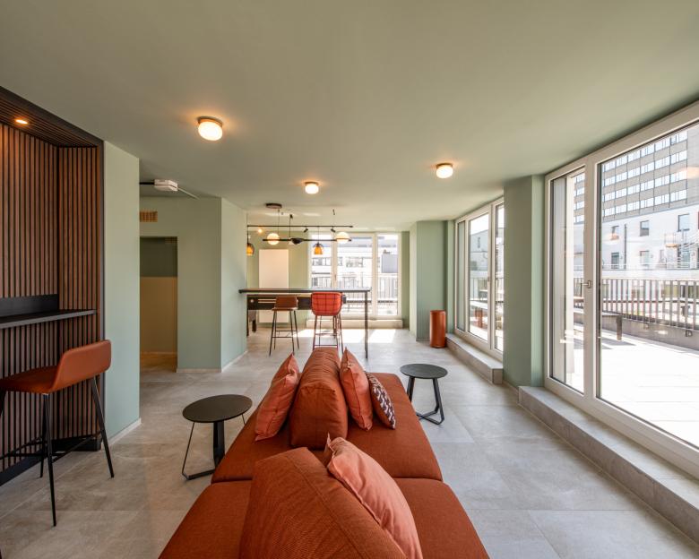 Zwischen alter und neuer Welt: Der Frankfurter Güterplatz verbindet die Bestandsviertel Gallus und Bahnhofsviertel mit dem neuen Europaviertel und der Messe. Auf der einen Seite kleinteilige Blockrandbebauung und multikultureller Alltag, auf der anderen hypermoderne Wohn- und Bürotürme neben dem Einkaufszentrum Skyline Plaza. Inmitten dieser Situation präsentiert sich das Wohnhaus Mainzer Landstraße als markanter Ruhepunkt in exponierter Lage. Es ersetzt ein zuletzt leerstehendes, nicht mehr sanierungsfähiges Bürogebäude der Concordia-Versicherung.