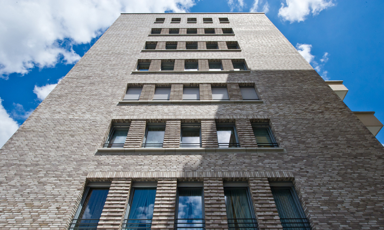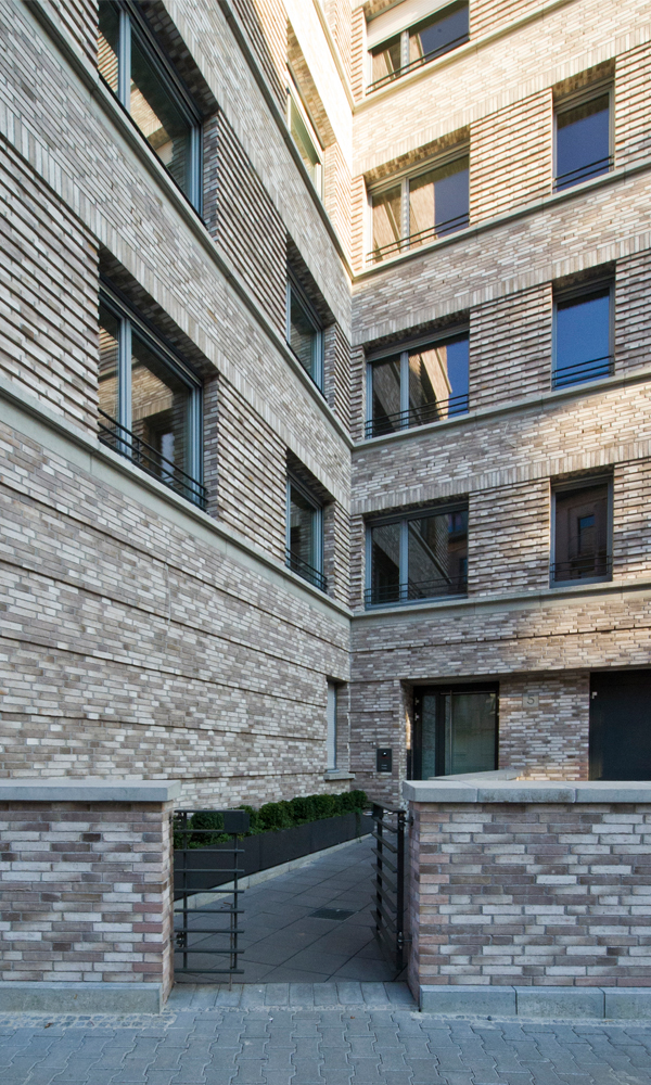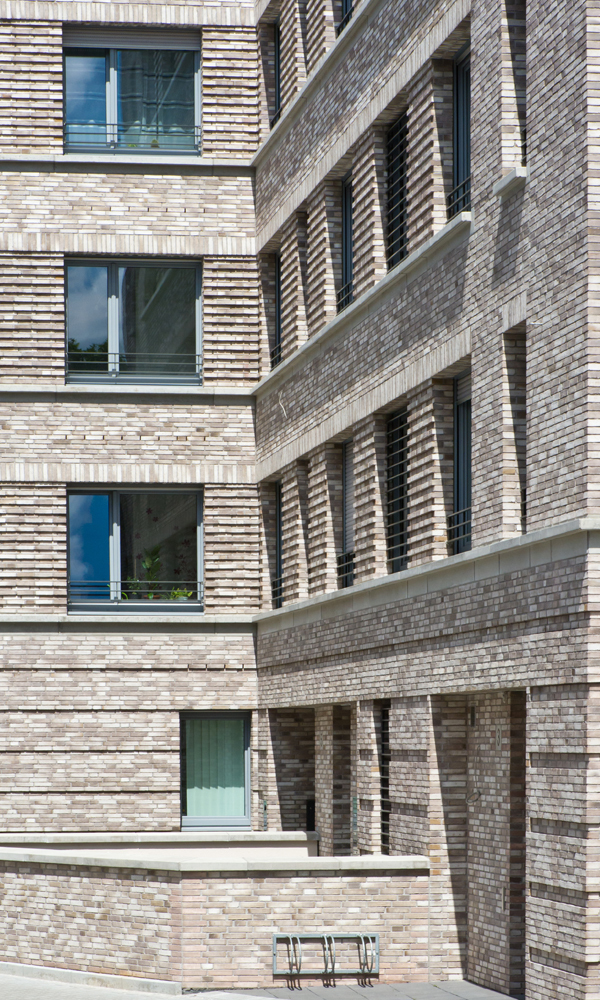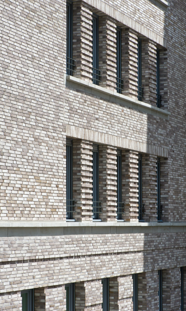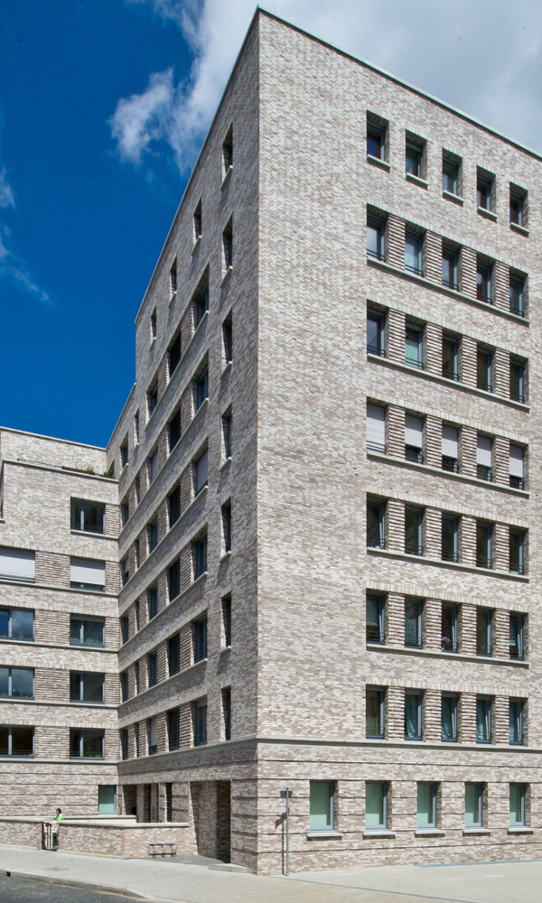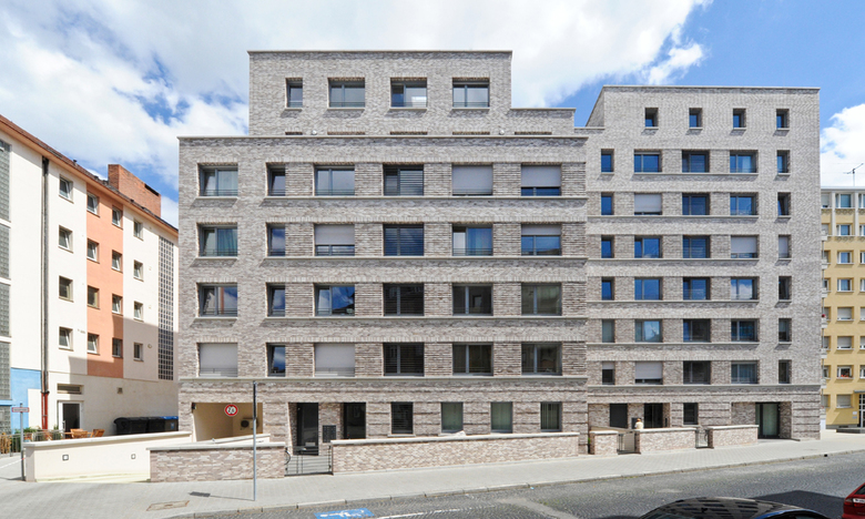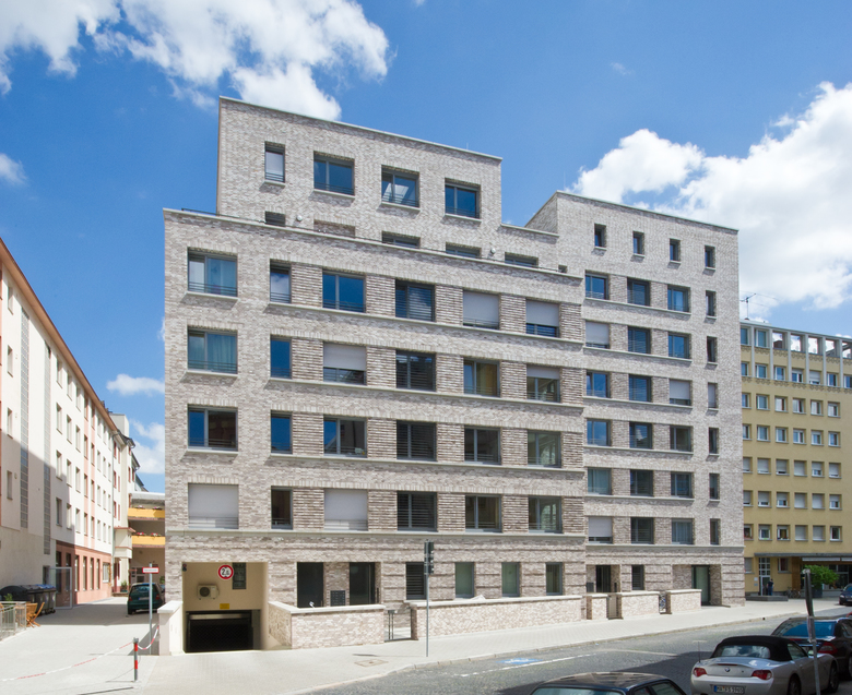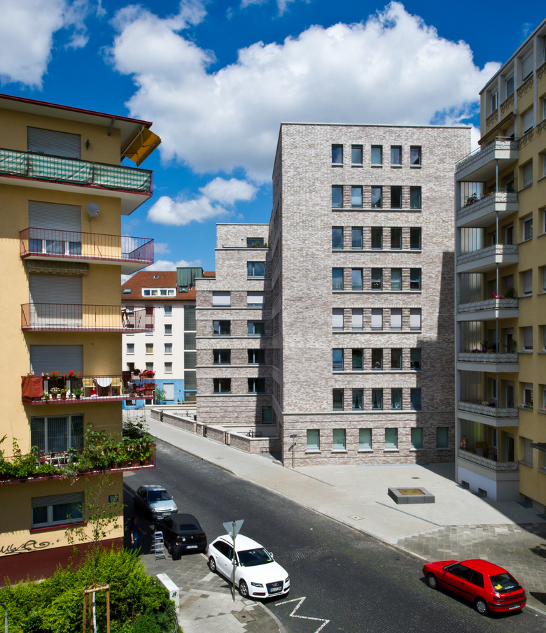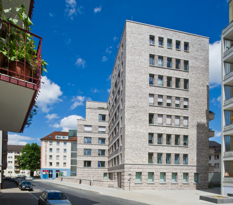 Der Neubau des Wohn- und Geschäftshauses des Spar- und Bauvereins Mannheim, hervorgegangen aus einem Wettbewerb, versteht sich als Bindeglied zwischen den verschiedenen Bauepochen des Kontexts. Die beiden zueinander versetzten Volumen thematisieren zum einen den gebogenen Straßenverlauf und stellen zum anderen eine Verbindung zwischen dem Blockrand und der südlich angrenzenden Hochhausbebauung aus den 1950er-Jahren her. Die straßenseitige Klinkerfassade bezieht sich in ihrer Sprache auf die Mannheimer Bautradition der Großblöcke. Die Hoffassade mit ihren durchlaufenden Balkonen öffnet sich zum Park. Im Erdgeschoß befinden sich die Geschäftsräume des Spar- und Bauvereins, in den Obergeschossen werden über zwei Treppenhäuser (3-Spänner-Typen) insgesamt 34 barrierefreie Wohnungen mit großzügigen Balkonen erschlossen. Die gewünschte Nachhaltigkeit wird mit dem Energiestandard KfW 40 erreicht.