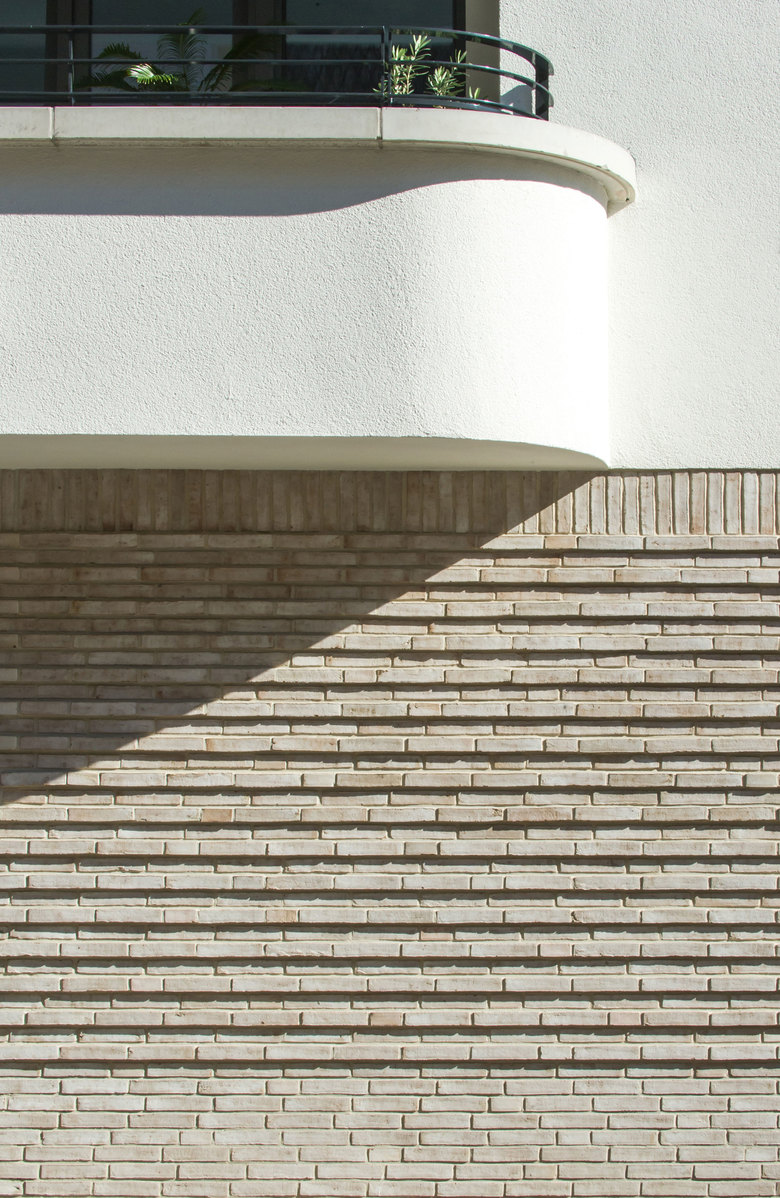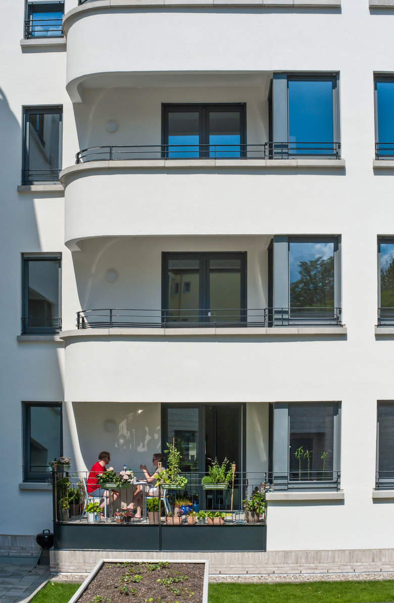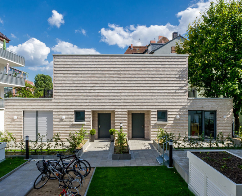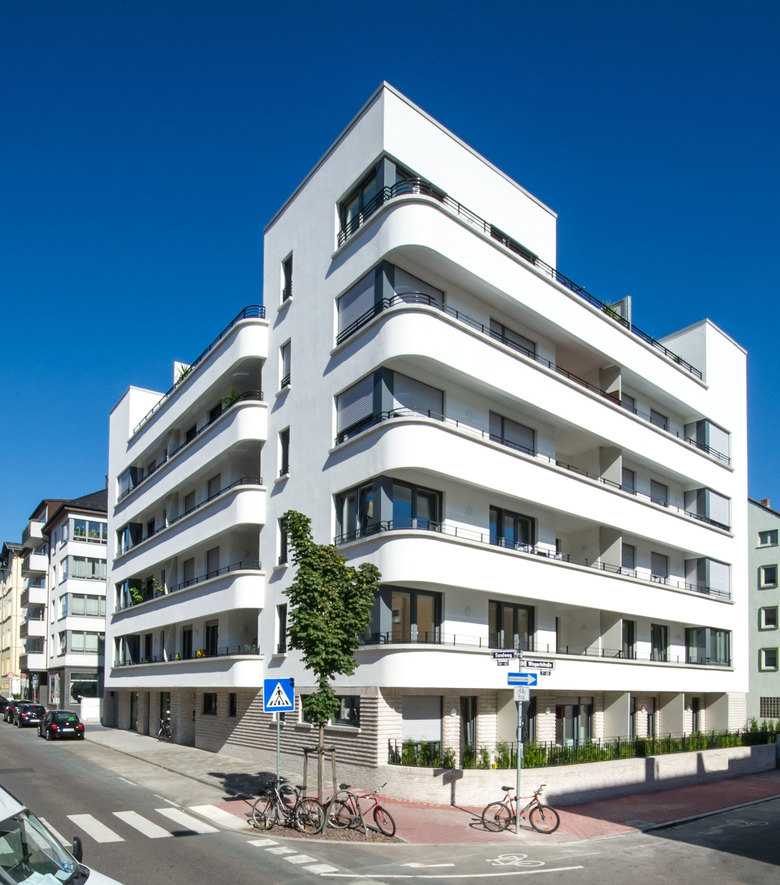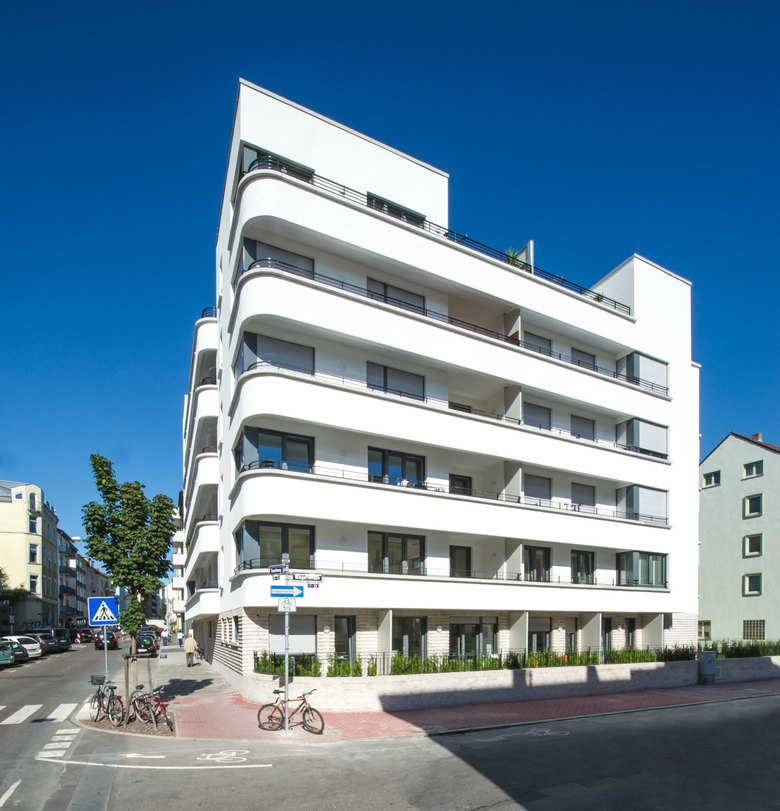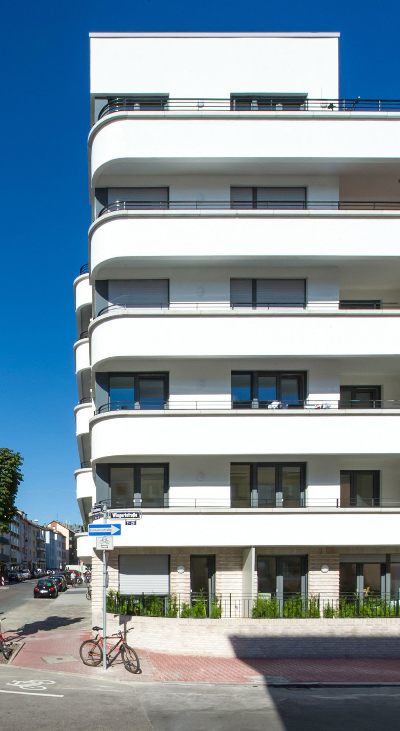 Auf dem Gelände einer ehemaligen Tankstelle am Sandweg in Frankfurt-Bornheim entstanden ein Wohnhaus mit 31 Wohnungen und einer Ladenzeile im Erdgeschoss sowie ein Doppelhaus im Innenhof. Maßstab und Proportionen des Hauses nehmen Bezug auf die umliegende Bebauung und wurden unter Berücksichtigung der Baufluchten zeitgemäß interpretiert. Die über dem verklinkerten Sockel ansetzenden, viertelkreisförmig abgerundeten Balustraden der Loggien und Balkone erinnern an die Architektursprache der vom Bauhaus inspirierten „Weißen Stadt“ in Tel Aviv. Die privaten Gärten entlang der Wingertstraße werden durch eine Klinkereinfriedung mit dahinter liegender Hecke gefasst. Zum Standard der vielfältig geschnittenen 1- bis 4- Zimmerwohnungen gehört jeweils mindestens ein Außenraum in Form von Gärten, Loggien, Balkonen und Terrassen. Das Staffelgeschoss ist partiell eingerückt. Im Hof nimmt ein Doppelhaus mit Patio die Abmessungen der hier ehemals verorteten Kfz-Werkstatt auf.