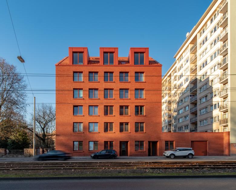 Das fünfgeschossige Wohnhaus mit Dachgeschoss an der Schloßstraße in Frankfurt-Bockenheim ersetzt einen überwiegend gastronomisch genutzten Flachbau. Es bietet Raum für 13 Wohnungen und eine Kita mit angeschlossenen Geschäftsräumen im Erdgeschoss und erstem Obergeschoss. Das Haus reagiert auf die städtebauliche Situation zwischen der Straße im Norden und dem Von-Bernus-Park im Süden. Der Baukörper greift die Bebauungs- und Trauflinie des Kontexts auf und fügt sich mit dem (traufständigen) Satteldach selbstverständlich ein. Reduzierte Lochfassaden gliedern die Straßen- und Giebelseiten, während sich die Rückseite mit bodentiefen Fenstern und Loggien zum KiTa-Garten und dem Park, dessen Eingang direkt an das Grundstück anschließt, hin öffnet. Mit ihrer monochromen Farbigkeit erscheint die rote Klinkerfassade einerseits vertraut und wohnlich, andererseits entsteht ein markanter Kontrapunkt zur gesichtslosen Wohnbebauung der 1960er-Jahre.
