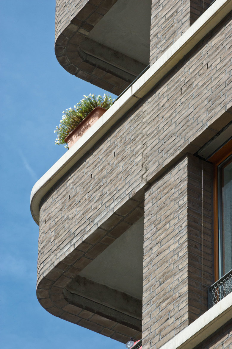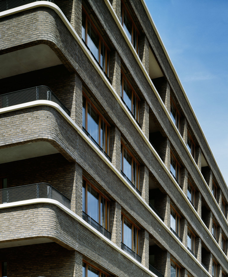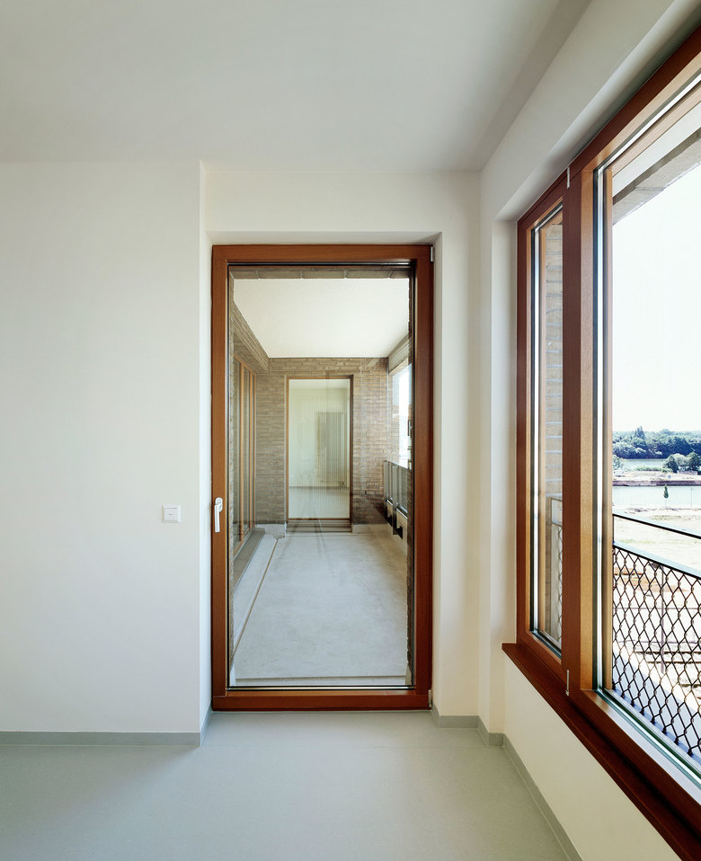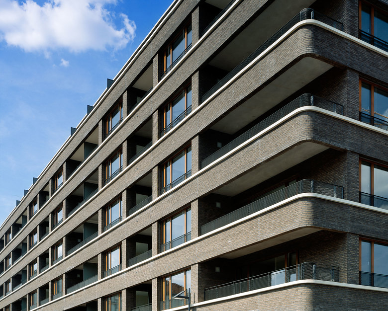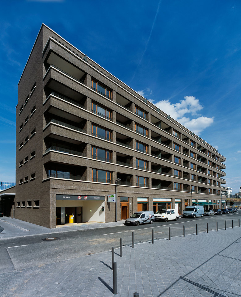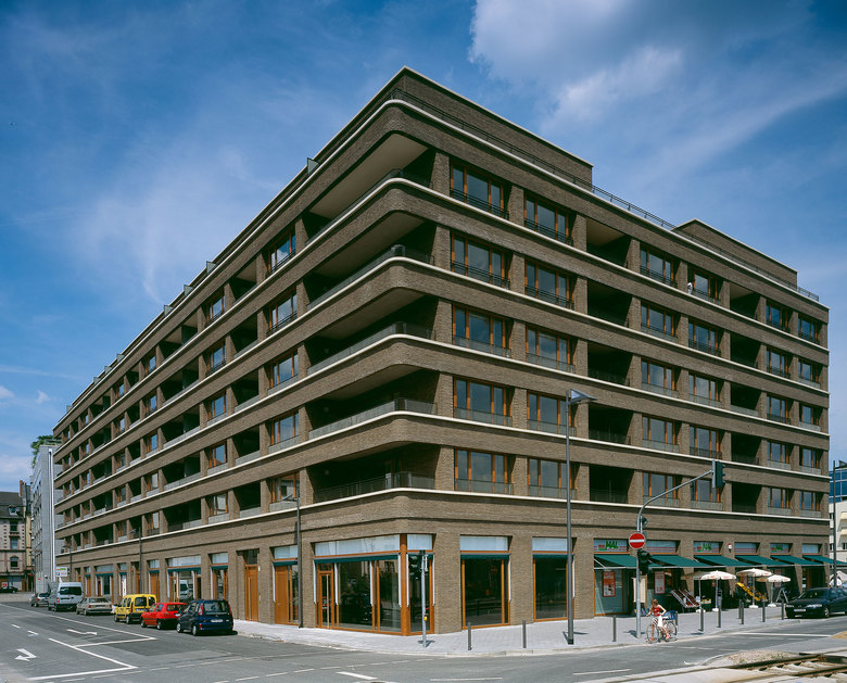 Das L-förmige, bis zu sieben Geschossen hohe Wohnhaus liegt an der Schnittstelle des noch jungen Frankfurter Stadtteils Westhafen mit dem nördlich angrenzenden Gutleutviertel. Dieser Situation entsprechend vermittelt das Gebäude städtebaulich zwischen den Solitärbauten des neuen und der gründerzeitlichen Blockbebauung des alten Viertels. Eine Ladenreihe mit Café im großzügig verglasten Sockel übernimmt eine wichtige Funktion in der Nahversorgung des Quartiers. Die urbane Nutzungsmischung spiegelt sich gestalterisch in einem differenzierten Fassadenaufbau: verklinkerte Brüstungsbänder, umlaufende, helle Gesimse, die markant abgerundete Ecke und die aufwändige Profilierung verleihen dem Gebäude eine klassische Eleganz, die an die großstädtische Architektur der 1920er-Jahre denken lässt. Markisen und Sonnenrollos, tiefe Loggien und Dachterrassen, Holzfenster und das eingerückte Dachgeschoss verleihen eine mediterrane Anmutung in unmittelbarer Flussnähe. Vier von der Straße erschlossene, ebenso lichte wie weite Treppenhäuser erschließen die insgesamt 70 Wohnungen.