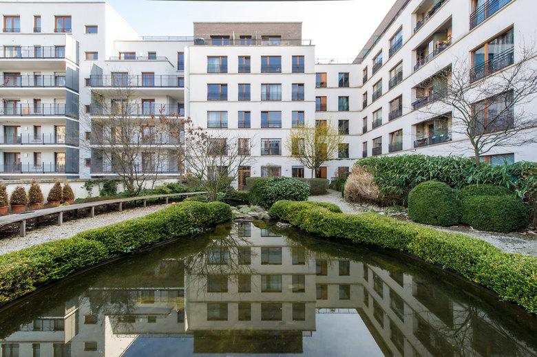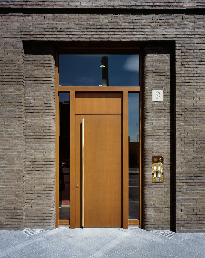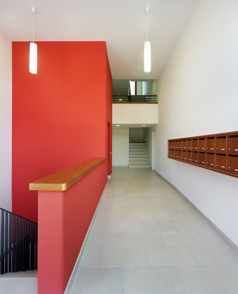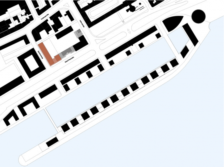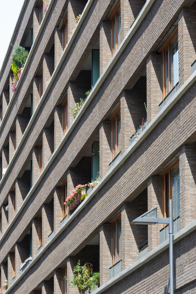 Das L-förmige, bis zu sieben Geschossen hohe Wohnhaus liegt an der Schnittstelle des noch jungen Frankfurter Stadtteils Westhafen mit dem nördlich angrenzenden Gutleutviertel. Dieser Situation entsprechend vermittelt das Gebäude städtebaulich zwischen den Solitärbauten des neuen und der gründerzeitlichen Blockbebauung des alten Viertels. Eine Ladenreihe mit Café im großzügig verglasten Sockel übernimmt eine wichtige Funktion in der Nahversorgung des Quartiers. Die urbane Nutzungsmischung spiegelt sich gestalterisch in einem differenzierten Fassadenaufbau: verklinkerte Brüstungsbänder, umlaufende, helle Gesimse, die markant abgerundete Ecke und die aufwändige Profilierung verleihen dem Gebäude eine klassische Eleganz, die an die großstädtische Architektur der 1920er-Jahre denken lässt. Markisen und Sonnenrollos, tiefe Loggien und Dachterrassen, Holzfenster und das eingerückte Dachgeschoss verleihen eine mediterrane Anmutung in unmittelbarer Flussnähe. Vier von der Straße erschlossene, ebenso lichte wie weite Treppenhäuser erschließen die insgesamt 70 Wohnungen.