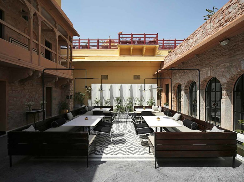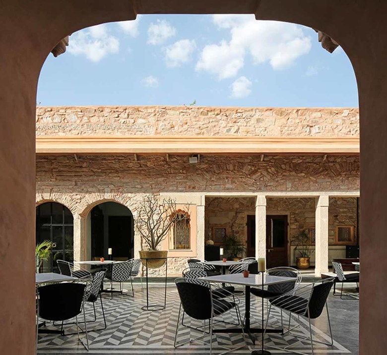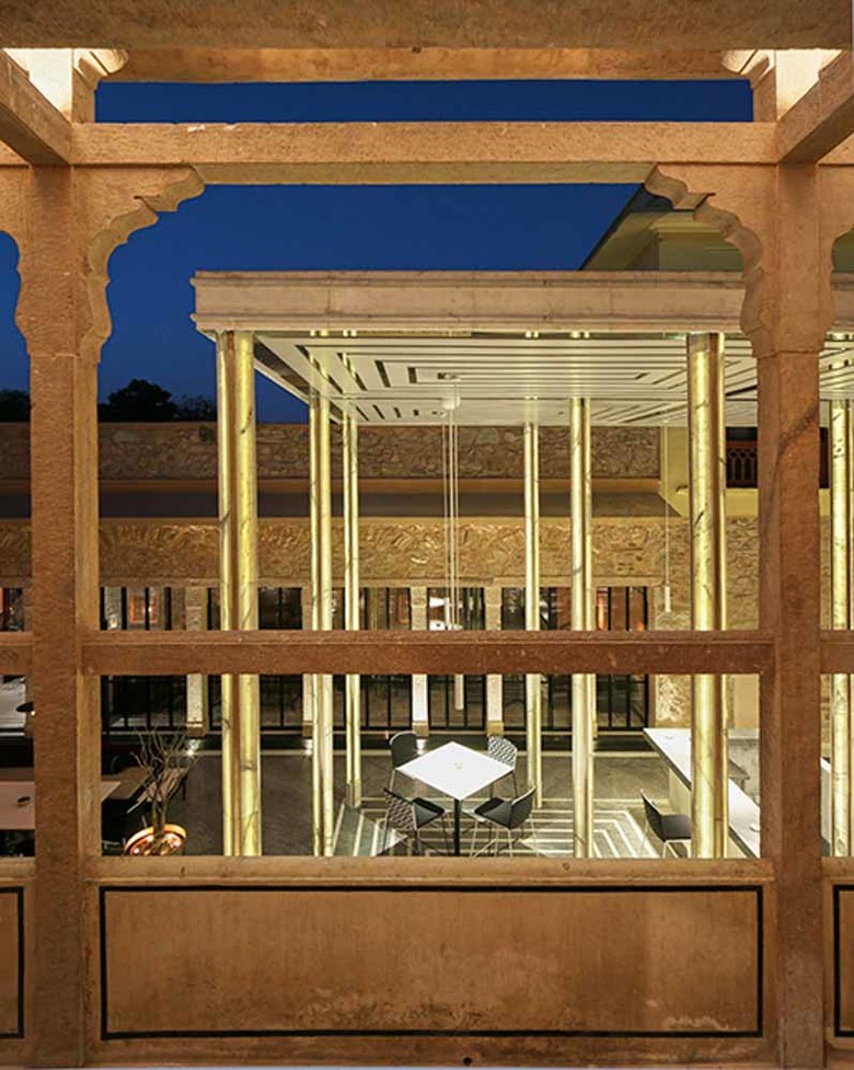 From structure to flooring to furniture units, stone masonry and inlay work have been given new expressions. The skilled artistry of local craftsmen in marble is given a graphic vocabulary for flooring, the Pavilion, dado work, benches, table tops and more. Marble benches line the deep verandahs enveloping the courtyard to create intimate dining spaces. Mild steel and brass are used for bespoke lighting and door design.