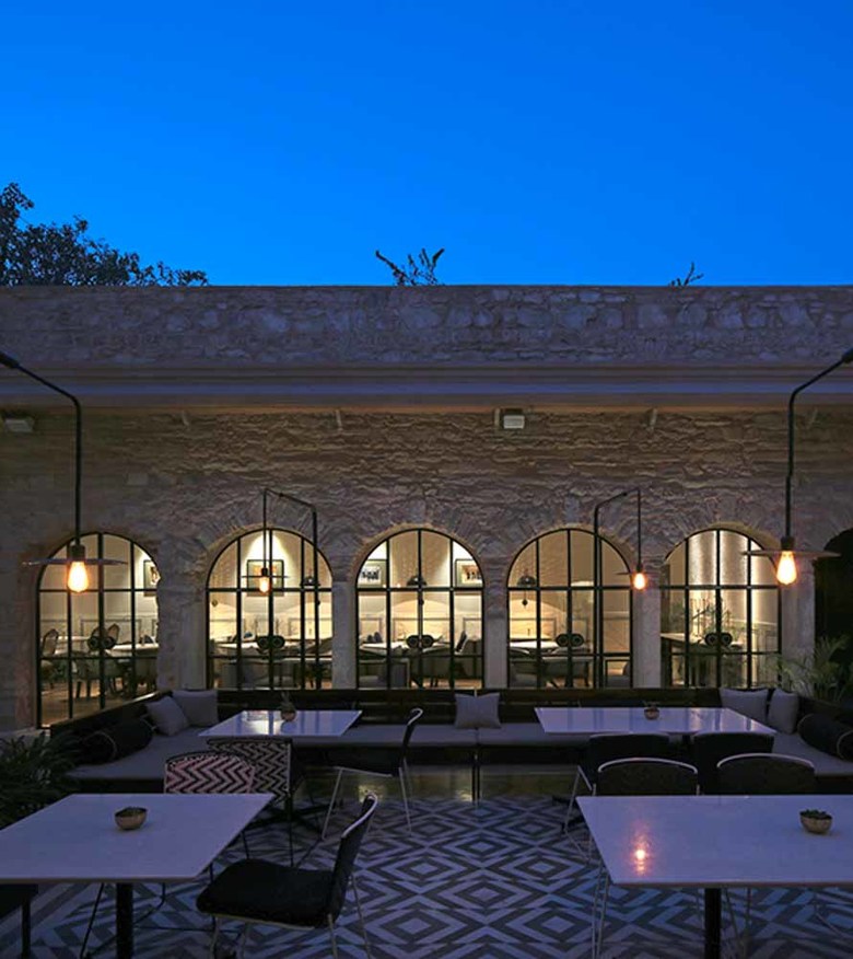 A key conceptual move was to use the courtyard as a binding element for the new program rather than just an extension of the restaurant. This meant dismantling an existing structure, being used as a toilet block, from the middle of the courtyard to open up the area both visually and spatially. A Pavilion in the form of a Baradari (literally translated - pavilion with 12 columns) was inserted in the form of a bar into the courtyard to divide yet link the two zones flanking it. Built in handcrafted marble and brass, the contemporary expression of the Baradari-inspired Pavilion heightens the surrounding historic vocabulary and gives the place its key identity.