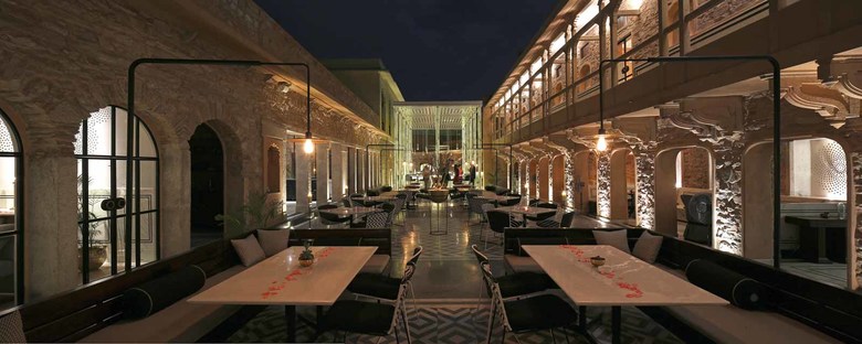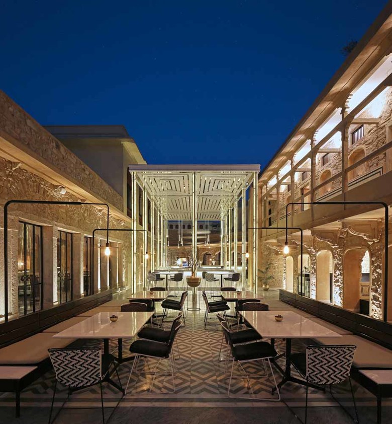 The site sits within the oldest walled quarter of the historic city of Jaipur within the City Palace Museum. The royal family of Jaipur invited the practice to redevelop the 14,000 sqft area of the former palace café as a fine dining destination. The brief was to expand the relatively non-descript café to include a private dining area, bar and various private lounges, along with a quick service counter to the program, while retaining the back of the house facilities in their current location.