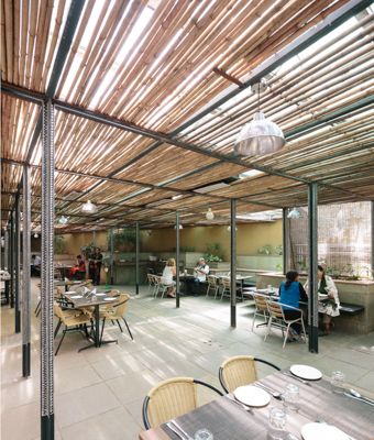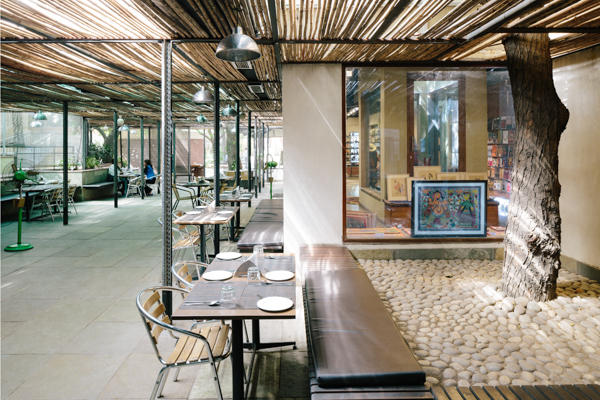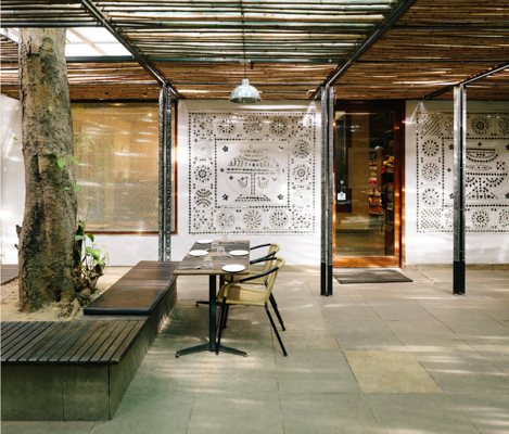 Café Lota is a natural extension of the Museum shop and is set in the negative space created by the boundary wall and the museum shop. A lightweight metal framework inserted into this odd volume ties the space together and creates nooks and portals for people to dine and converse in. Negative spaces are filled with plants to create a light and airy yet shaded enclosure that makes full use of the beautiful trees and painted walls that surround the eatery. A lightweight bamboo trellis of varying density brings dappled light into the space through the day.