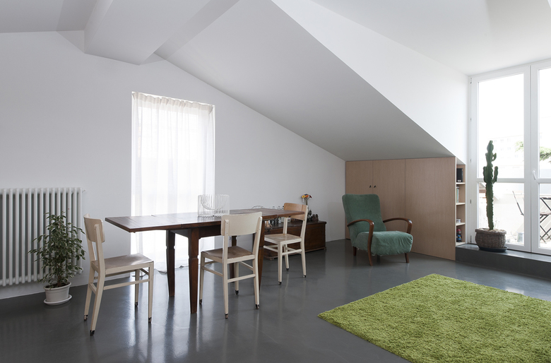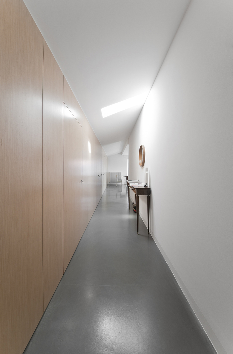 L’appartamento è caratterizzato dalla presenza di un unico elemento di arredo fisso, un diaframma che divide i differenti ambienti e funge da contenitore.