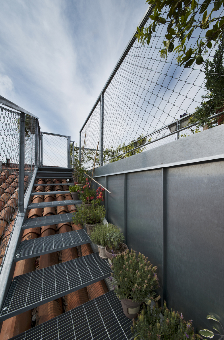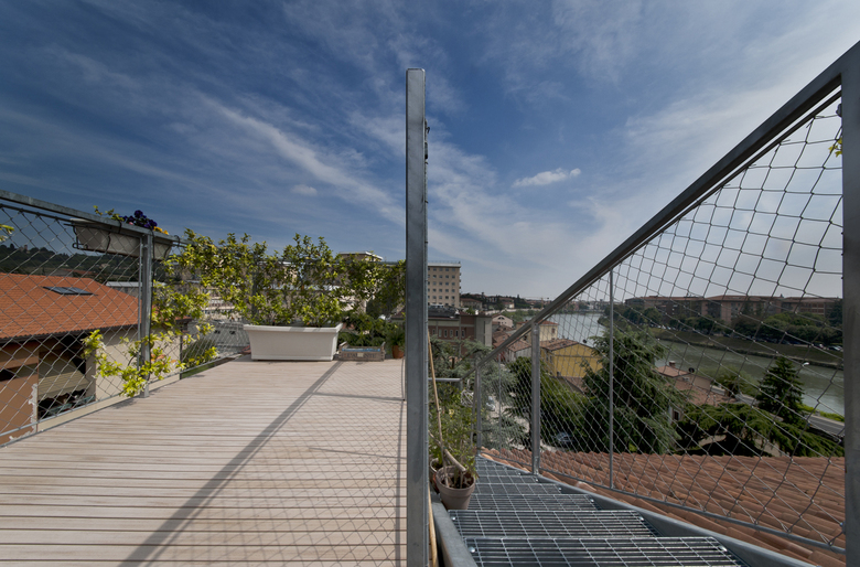 Dalla porta finestra dell’abbaino si accede ad un piccolo terrazzino a tasca con vista sul fiume Adige, dal quale attraverso una scala metallica, si accede ad un’altana posta in corrispondenza della copertura piana dell’abbaino.