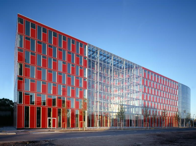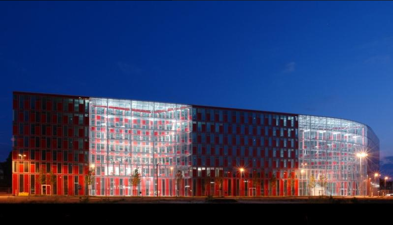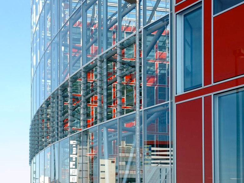 Das Capricornhaus bildet das neue Entrée am südlichen Ende des Düsseldorfer Hafens, einer ehemaligen Industriebrache. Die großen Glashallen bilden in Verbindung mit einer zweiten Schallmembran den Rahmen für eine individuelle Bürowelt, die auch den Anforderungen an ein Low-Energy-Gebäude entspricht. Die Besonderheit des prägnanten Neubaus mit seinen roten Glaspaneelen liegt vor allem in der von GATERMANN + SCHOSSIG konzipierten i-modulFassade. Die schallemissionsbelastete Lage des Gebäudes führte zur Entwicklung des multifunktionalen Fassadenmodules, das die gesamte notwendige Technik beinhaltet um das Raumklima individuell zu steuern. Es ist ausgestattet mit einem eigenen Lüftungssystem zum Kühlen, Heizen, Lüften und zur Wärmerückgewinnung. Außerdem sind in dem Fassadenpaneel Beleuchtungs-, Schallabsorptions- und Raumakkustikelemente integriert. Der Wegfall traditioneller Technikflächen durch das dezentrale Konzept bringt große Freiheitsgrade bei der inneren Gebäudeplanung mit sich. Die flexible Grundrissgestaltung ermöglicht die Realisierung aller Büroformen. Zukünftige Anforderungen an das Gebäude werden geprägt durch weitere ökologisch-energetische Randbedingungen wie: Kompakte Bauweise mit zukunftsweisenden Bauteilen, beispielhafte Wärmedämmung, innovative Lüftungsanlagen mit Wärmerückgewinnung, Betonkernaktivierung in Verbindung mit Kältegewinnung aus Grundwasser (Geothermienutzung) sowie ein natürliche Belüftungskonzepte sowie moderner MSR Technik für geringe Betriebskosten. Damit ist das CapricornHaus ein innovatives Gebäude, das Einsparungen im Primärenergiebedarf von 26% unter der erforderlichen Energieeinsparverordnung erzielt.