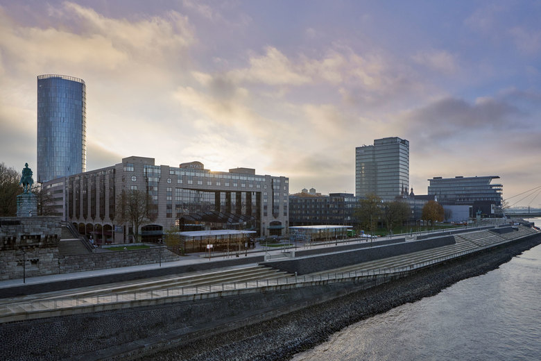 Um die besondere Situation im Stadtraum hervorzuheben, basiert das architektonische Konzept darauf, den Ort gefühlsmäßig als öffentlichen Raum auszubilden und das Gebäudeensemble zu einer Erweiterung des Rheinboulevards und seiner Treppen werden zu lassen. Jegliche gebäudehafte Erscheinung des Komplexes soll hierfür auf ein Minimum reduziert werden. Neben einer objekthaften, klaren Form der Architektur ist für diesen Prozess der Auflösung „weg vom klassischen Gebäude“, die Gestaltung von Fassade und Dach von immenser Bedeutung. Gatermann + Schossig Architekten schlug einen Künstlerwettbewerb vor, der sowohl bei der Stadt als auch beim Bauherrn auf Zustimmung stieß. Der Wiener Künstler Peter Kogler konnte mit seinem Konzept die Jury überzeugen und brachte seinen Wettbewerbsentwurf in die Realisierung.