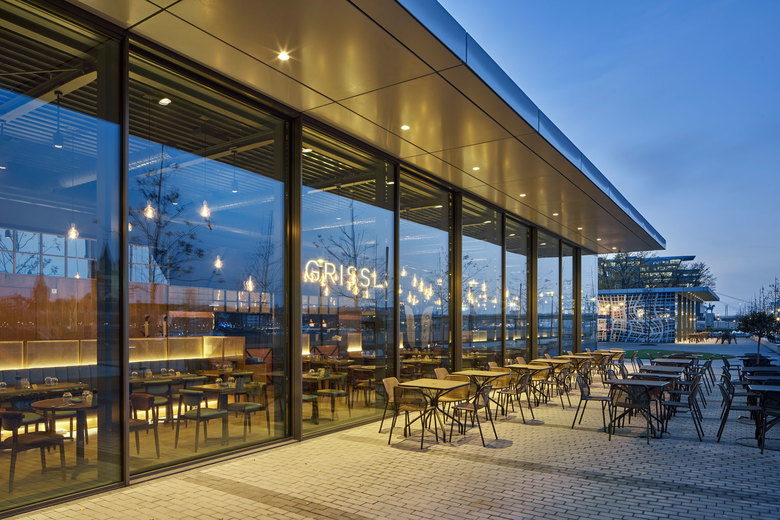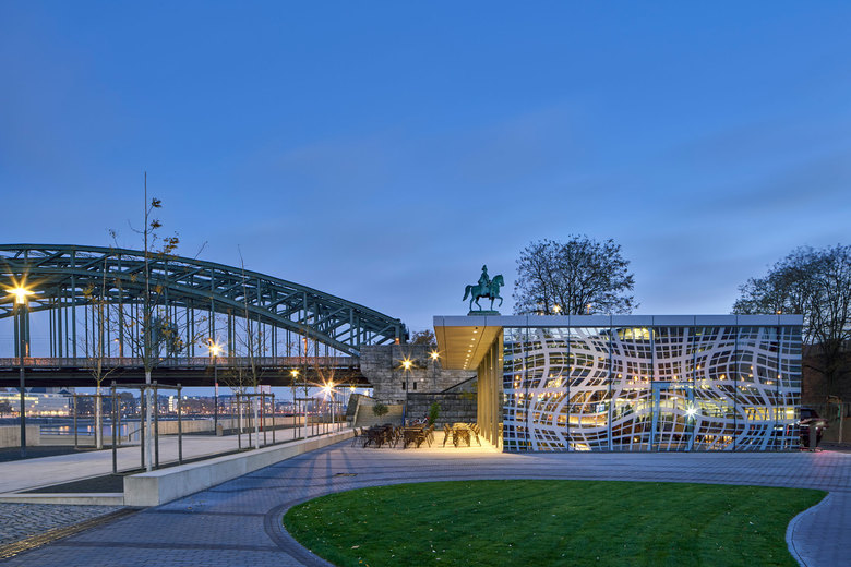 Die Planung der besonderen, durch Gatermann + Schossig entwickelten Glaskonstruktion, mit großen und bis zu 400 kg schweren raumhohen Gläsern, erforderte besondere Kenntnis und Ausführungsqualität. Eine weitere Herausforderung an die reduzierte Formensprache war unter anderem die Integration der erforderlichen Technik und aller spezifischen Restaurantbedürfnisse. So wurde der innere aussteifende Betonkern in die Raumkonzeption einbezogen, die Lüftungs- und Küchentechnik innerhalb der Dachkonstruktion integriert und die Rheinseite mit großen Glasschiebewänden versehen, die vollständig geöffnet werden können. Insgesamt bieten die beiden Pavillons 220 Innen- und 150 Außensitzplätze von denen man einen phantastischen Blick auf den Kölner Dom genießt.