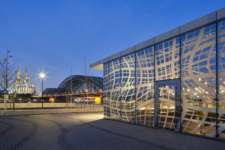 Drei gläserne Seitenwände sowie das geschlossene Dach, das als fünfte Fassade wichtig für den Blick aus dem Hyatt und von der Hohenzollernbrücke ist, gestaltete der Künstler mit einem oszillierenden, dreidimensional wirkenden Ornament. Es projektiert eine abstrakte Spiegelung der Hohenzollernbrücke in der Wasseroberfläche auf die Pavillons und prägt sie in ihrer Nah- und Fernwirkung.