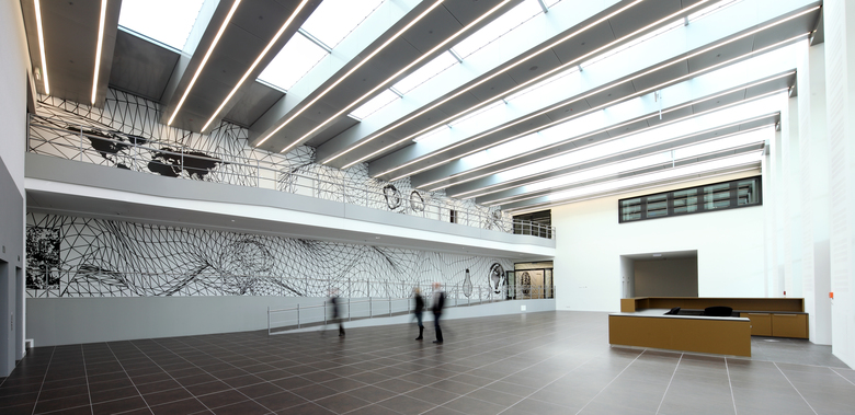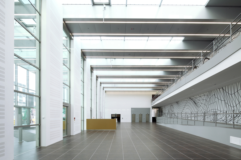 Eine offen gestaltete gläserne Eingangshalle verbindet den Verwaltungsbereich mit dem Kriminaltechnische Institut. Trotz hoher Sicherheitsanforderungen zeichnet sich das Gebäude dank seiner gläserne Eingangshalle durch eine offene, kommunikative Transparenz nach außen aus. Von diesem zentralen Zugang werden über eine die Baukörper schräg durchlaufende Magistrale alle Bereiche erschlossen. Der Künstler Peter Kogler gewann den ausgelobten Kunstwettbewerb zur Gestaltung dieser Hauptachse. Der erdgeschossige Weg führt an attraktiven Innenhöfen entlang, die auch von den Sitzungsräumen aus nutzbar sind, und ermöglicht eine klare Orientierung im Gesamtgebäude.
