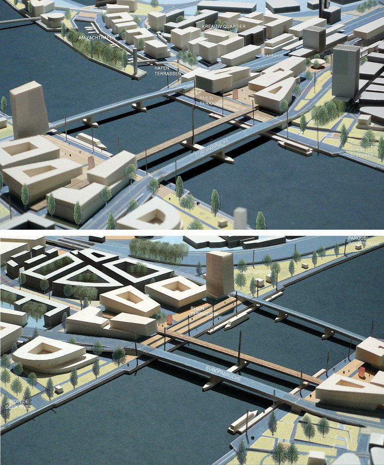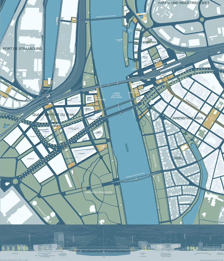 Auf Straßburger und Kehler Rheinseite werden die beiden neuen Uferquartiere mit korrespondierender Raum- und Baustruktur sowie komplementären Funktionen und kompositorisch gesetzten Akzenten zum flussübergreifenden Ensemble. Zum Rhein öffnen sie sich mit jeweils auf Brückenniveau angehobenen Uferplätzen, deren Terrassen zu den flussbegleitenden Promenaden führen.