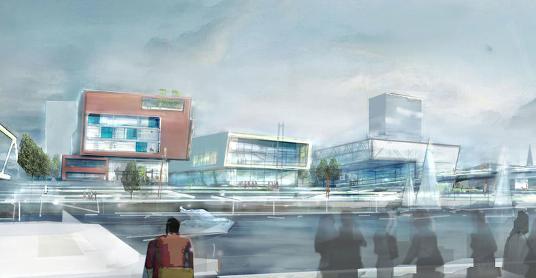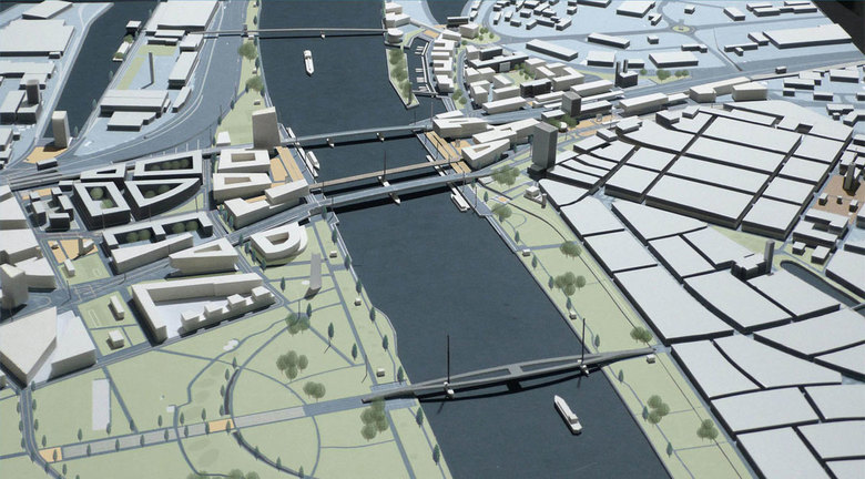 Der so von Platztribünen und Brücken eingefasste Flussraum wird zum „Rheinforum“ und über Alltagsaktivitäten hinaus zu einem Aktionsraum für besondere stadt- und länderübergreifende Freizeit-, Sport- und Kulturveranstaltungen. Mit seiner spezifischen Bau- und Raumstruktur und einer landschaftlich-topografischen Einbindung werden beide Uferquartiere zum morphologischen Bestandteil der weitläufigen Rheinlandschaft.