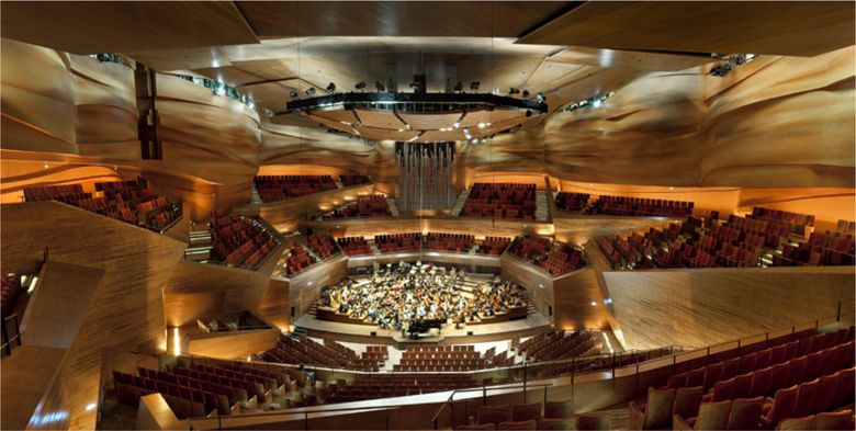 Behind its fibreglass skin, then the surprise inside: The actual concert hall hangs like a meteorite in a steel construction. Jean Nouvel, an architect from France, came up with this idea.