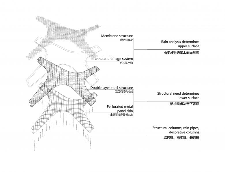 The surface curvature of the canopy is calculated through the simulation of rain and sunshine, which determines the form prototype of high middle and low circle, so as to achieve the best drainage and shading effect. The thickest of the slender steel columns are structural columns, and the rest are drainage tubes, cable tubes and decorative columns. Different pipe diameters represent the different functions undertaken by them. The space atmosphere is clean, pure, and orderly as if shuttling through the bamboo forest. Viewed from a distance, the entire canopy seems to float above the venue, but also like a white cloud wing, overshadowing the entire venue.