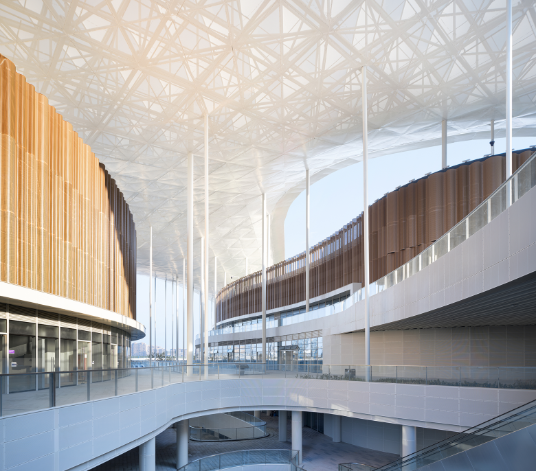 The venues are woven together through a ribbon of public platforms on the second floor and connected to the city streets as part of the street network. The architectural facade extracts curvilinear elements from traditional cultural symbols such as silk belts, scrolls and tile roofs, and uses curved perforated aluminum plate material to create the image of Jiangnan with continuous waves. The perforated patterns in different proportions and forms of the perforated aluminum plate give the facade a unique technical rhythm, a continuation of the traditional textile craftsmen’s poetry, and arouse the public’s memory of regional culture.