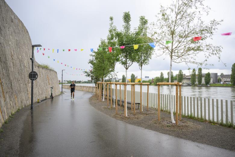 Am Rheinufer zwischen dem St. Johanns-Park und der französischen Grenze, wo früher ein geschlossenes Hafenareal lag, ist eine neue Promenade für Fussgänger und Fahrradfahrer entstanden. Sie ist das Resultat von neun Jahren Planung und Bau. Die über 600 Meter lange Promenade zwischen Rhein und Novartis Campus ist nur 10 bis 30 Meter breit, überwindet aber eine Höhe von bis zu 10 Metern.