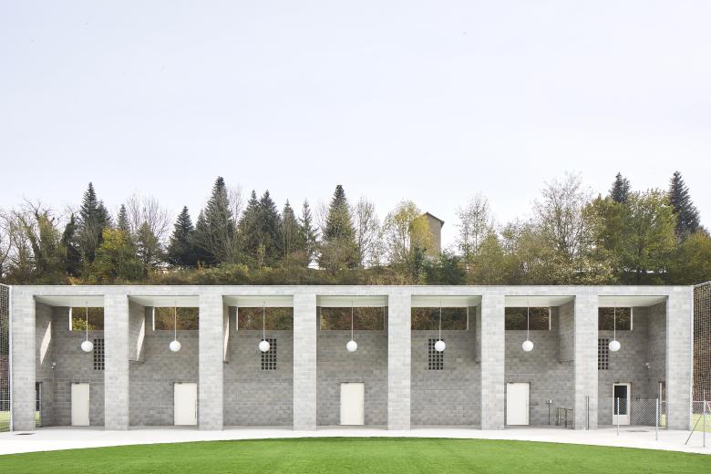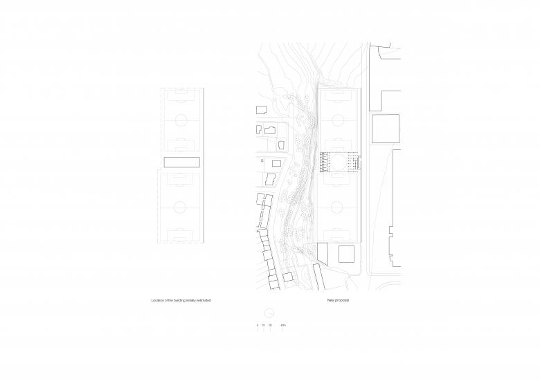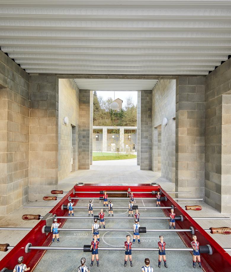 Una plaza cuadrada, definida por dos porches y abierta a los campos de fútbol. Este es el centro de la "ciudad deportiva" del Morrot en Olot. Es también la respuesta a las contradicciones entre el uso y el emplazamiento: un polígono industrial y una calle de acceso casi sin aceras.