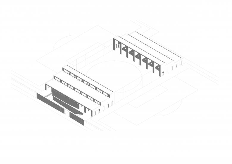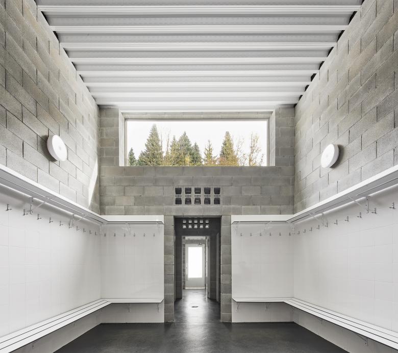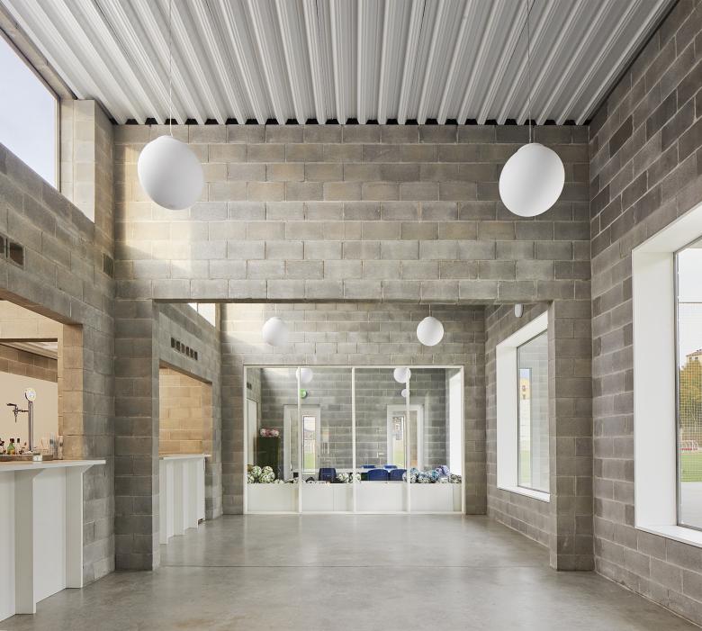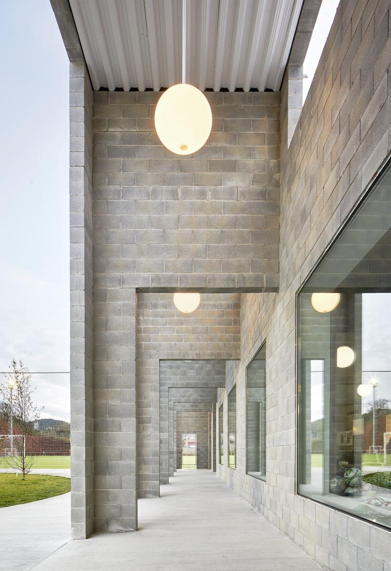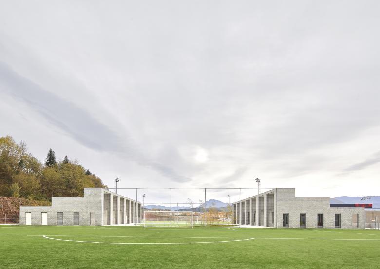 Los pabellones son gemelos pero no son iguales. Comparten perfil y porches, pero mantienen diferencias derivadas de la posición y el uso: uno está destinado a vestidores y el otro, a recepción, cafetería y servicios. Su volumen escalonado se ajusta tanto a las proporciones de la plaza como a la organización interna.