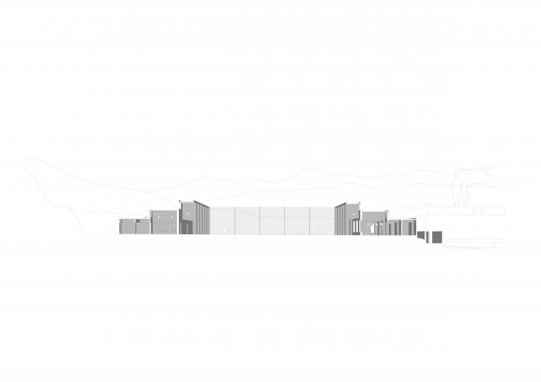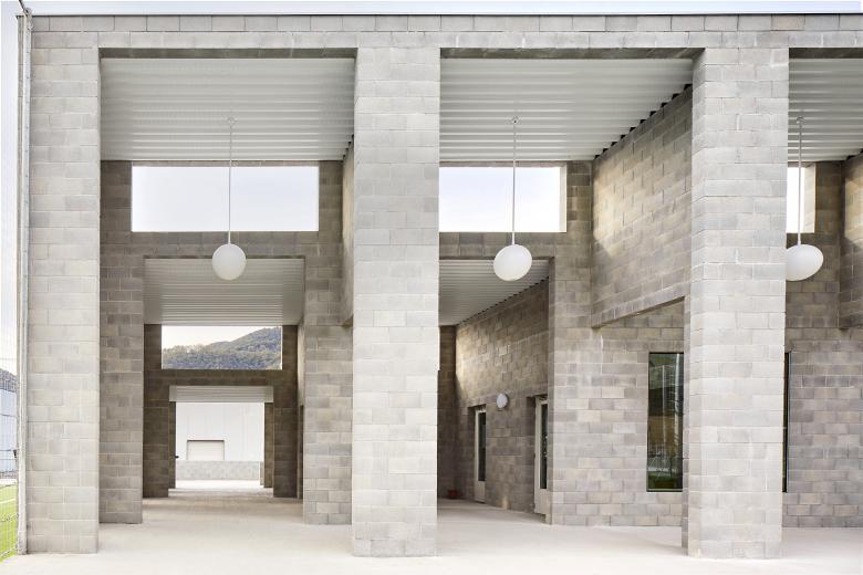 La plaza conecta visualmente con los elementos geográficos naturales, el perfil de los montes que confinan la comarca. Al mismo tiempo, se aparta de las fábricas y de la calle transitada por camiones. El conjunto se asienta sobre una plataforma horizontal. Una interrupción en este basamento da inicio a un recorrido de entrada complejo y gradual: cancel, escaleras y rampa, porche a tres alturas, para desembocar de forma tangencial en el espacio central.