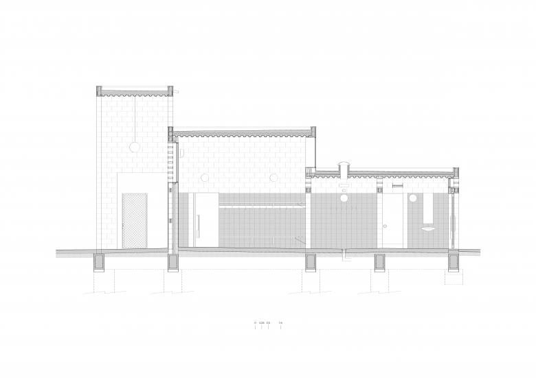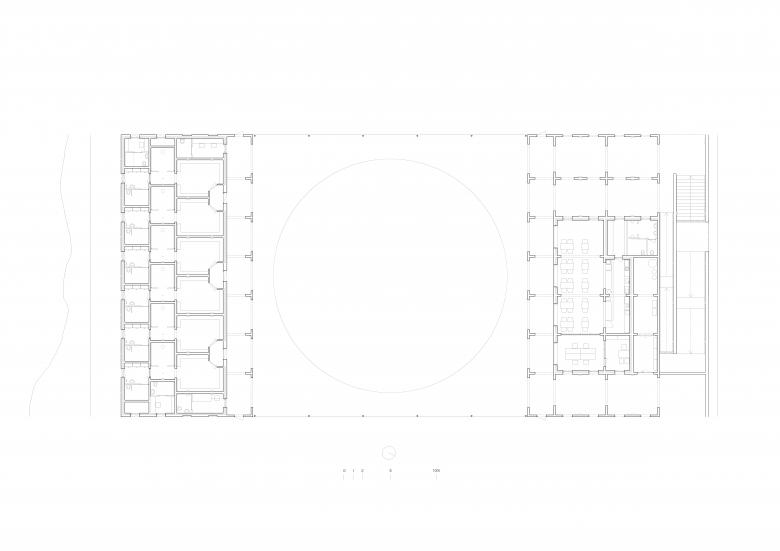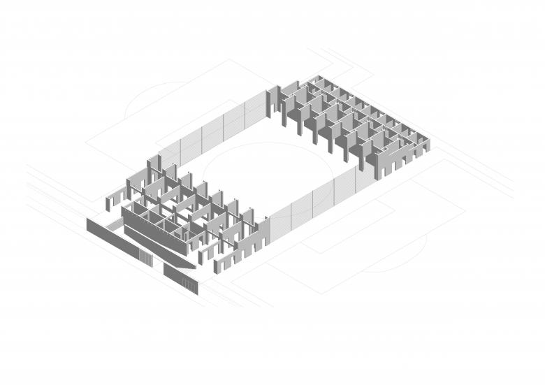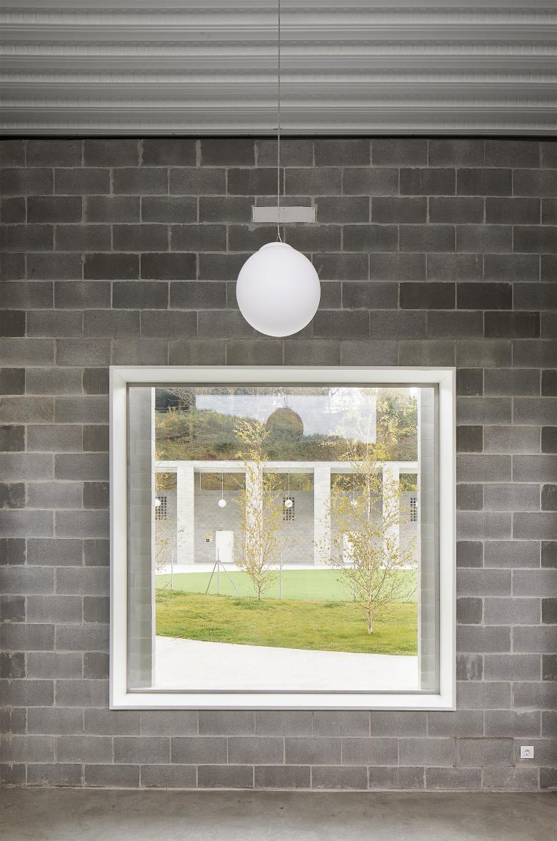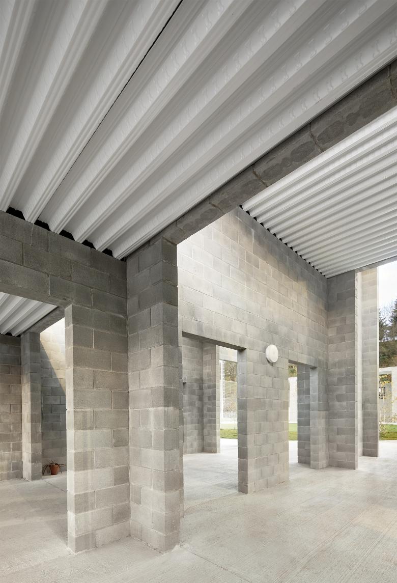 Todo es estructura. Atendiendo al reducido presupuesto (620€/m2), se invierte en aquello más trascendente: la activación de un lugar común, el volumen generoso de los espacios interiores y la entrada de luz natural. En este sentido, la construcción con muros portantes de bloque de mortero es sencilla y de fácil ejecución. Su lógica interna define la caligrafía de la obra y pauta la medida de las estancias.